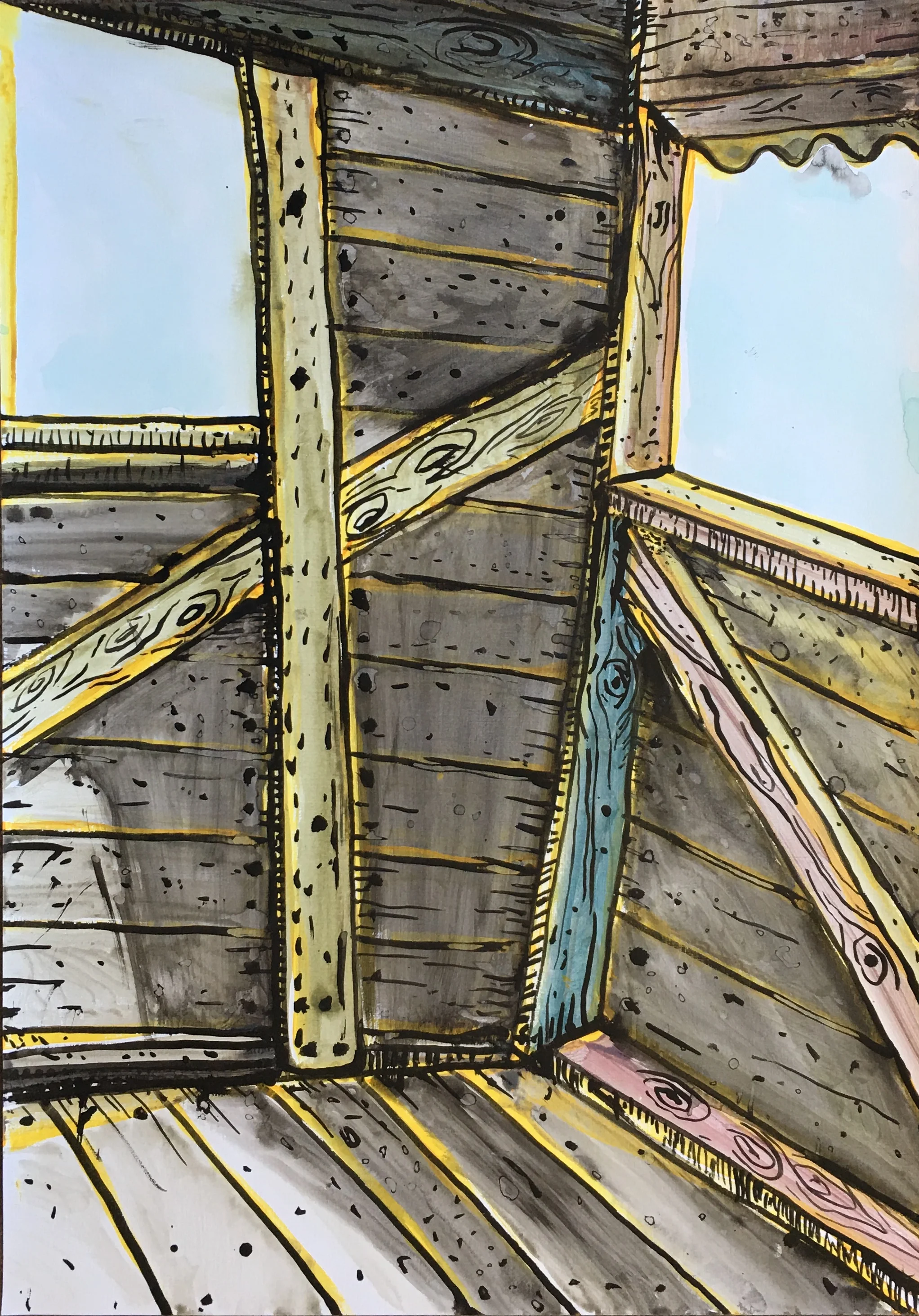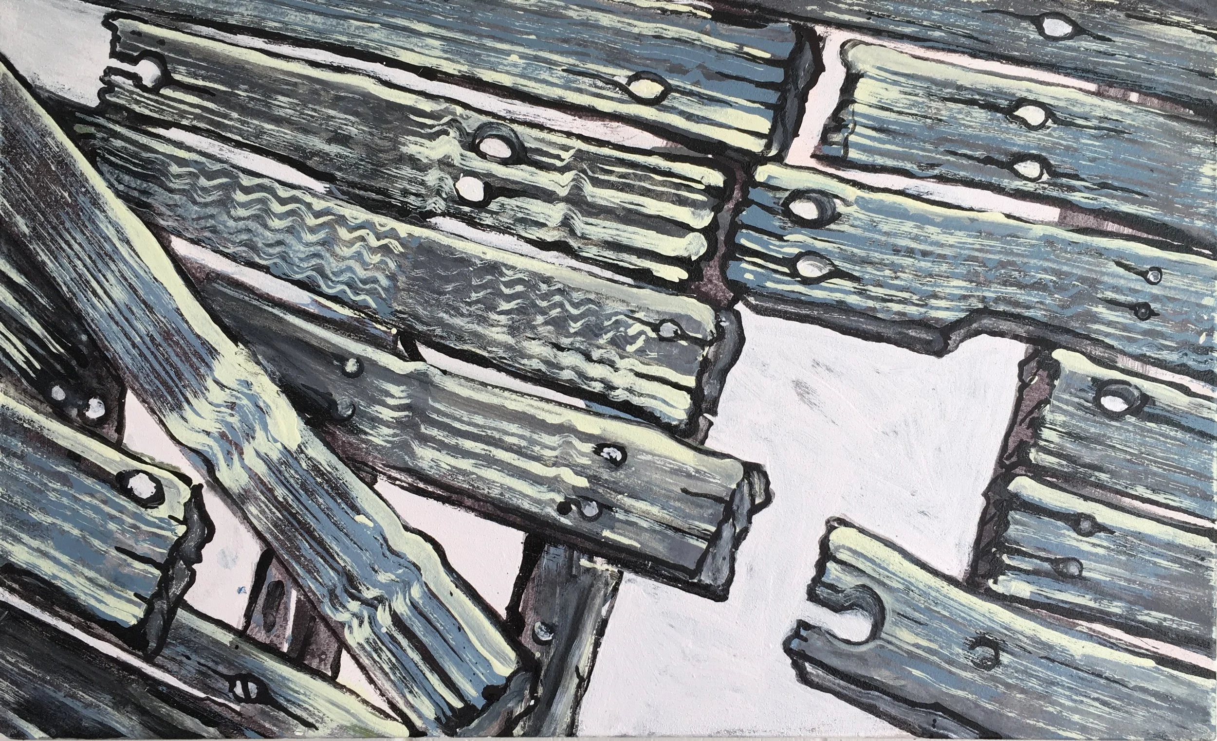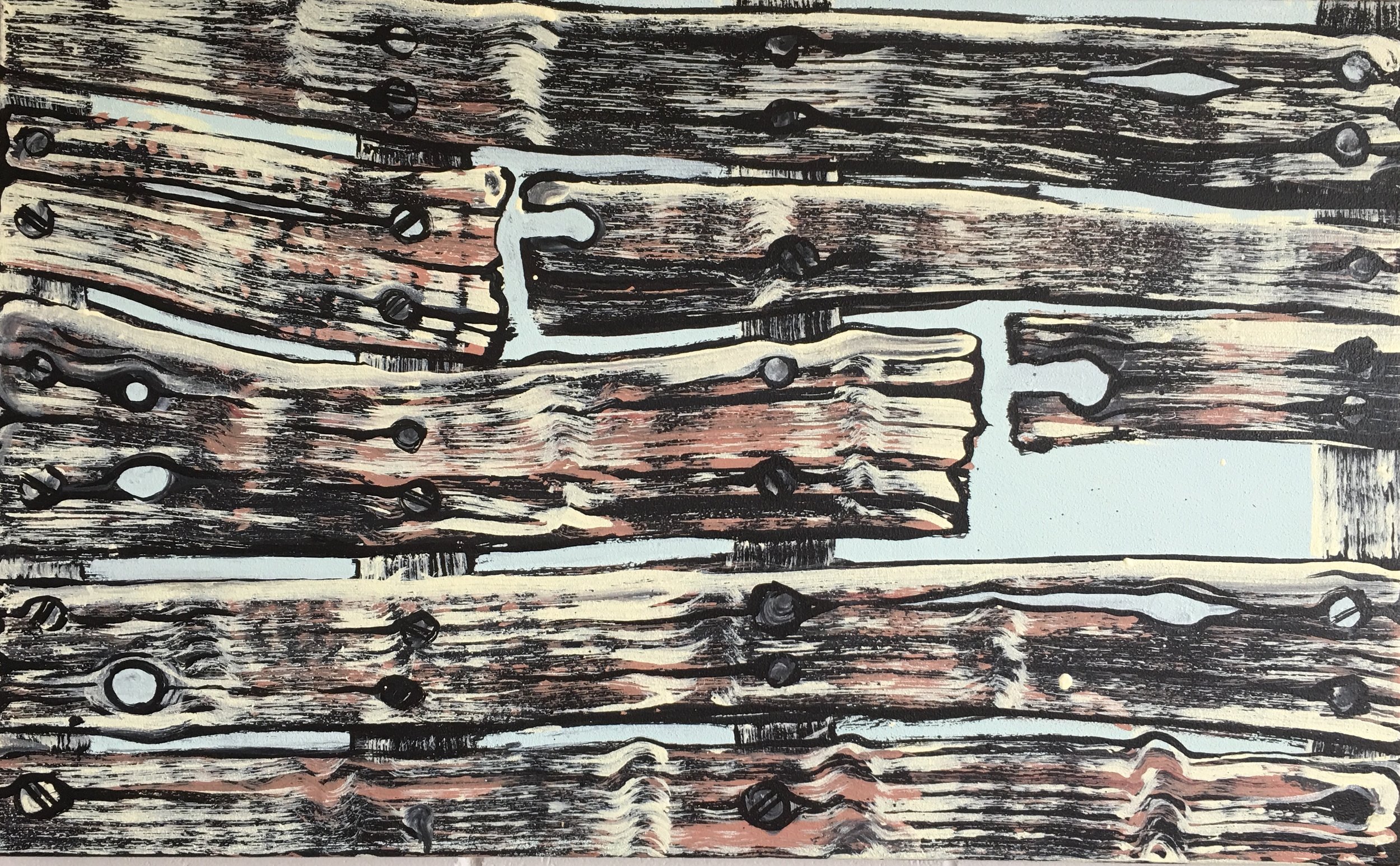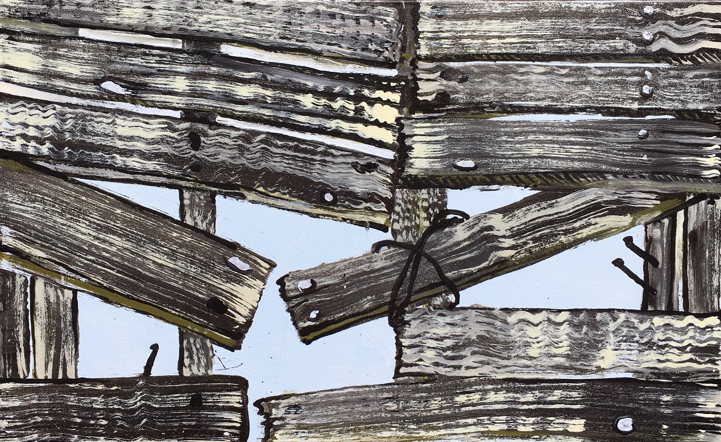 In the current exhibition we are presented with very particular views of parts of sheds and other rural structures. Nails proliferate and are given personalities at odds with their metallic being. There is a sort of naïve directness in the manner in which Taylor configures his images. The faults and flaws that characterise his decaying structures do not seem out of place. Rather they are integral reminders of the processes the walls and floors are undergoing, and indeed invite us to embrace these processes. In a sense Taylor celebrates what once was while pictorializing its decay. There is however an attractive warmth imbued into these works through the artist’s use of soft atmospheric colours and the clever use of black in the outlining of the structures. Taylor has developed his pictorial language to a level of finesse and certitude that speaks of his deep attachment to place and to his concomitant attachment to the activity of painting.