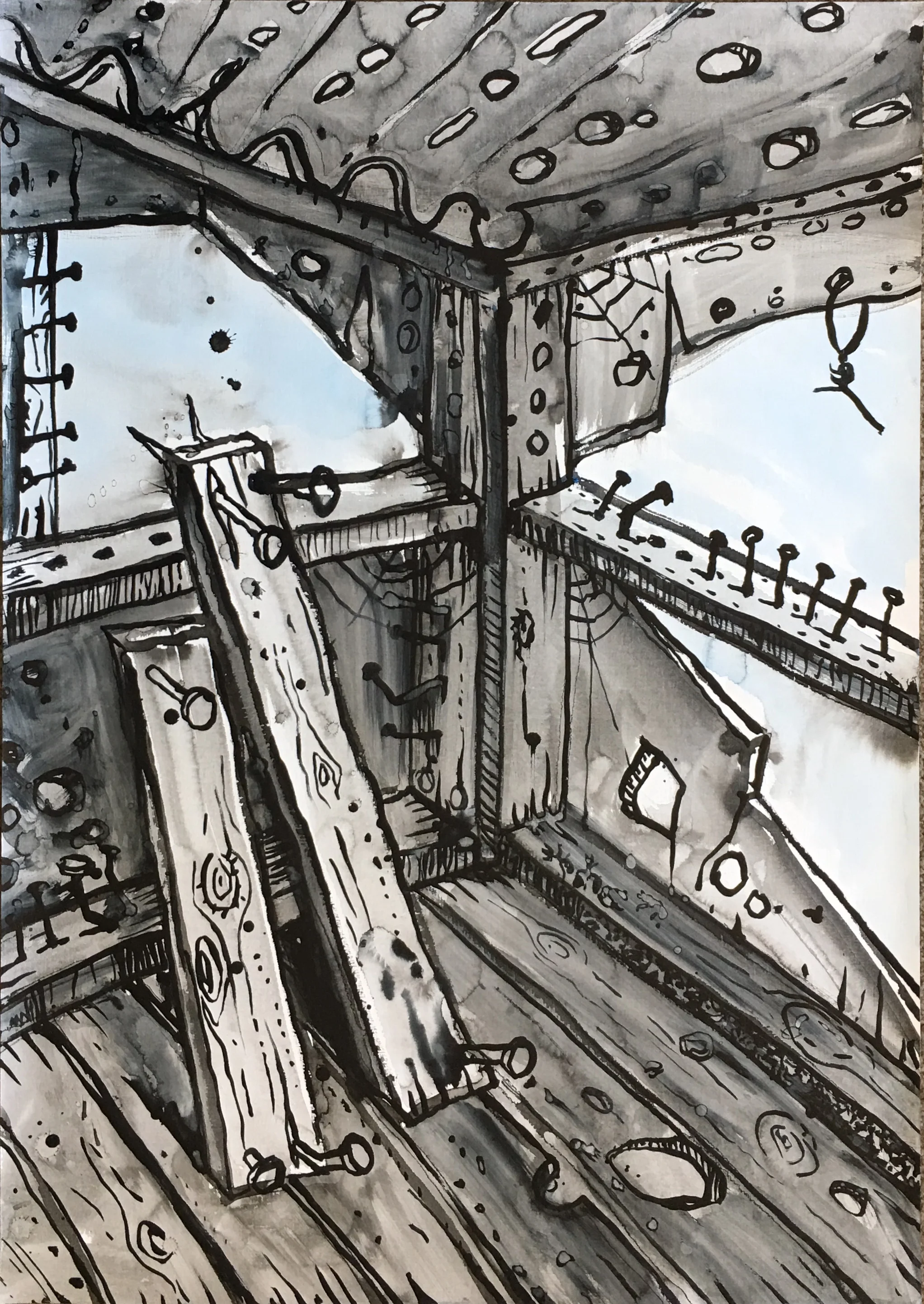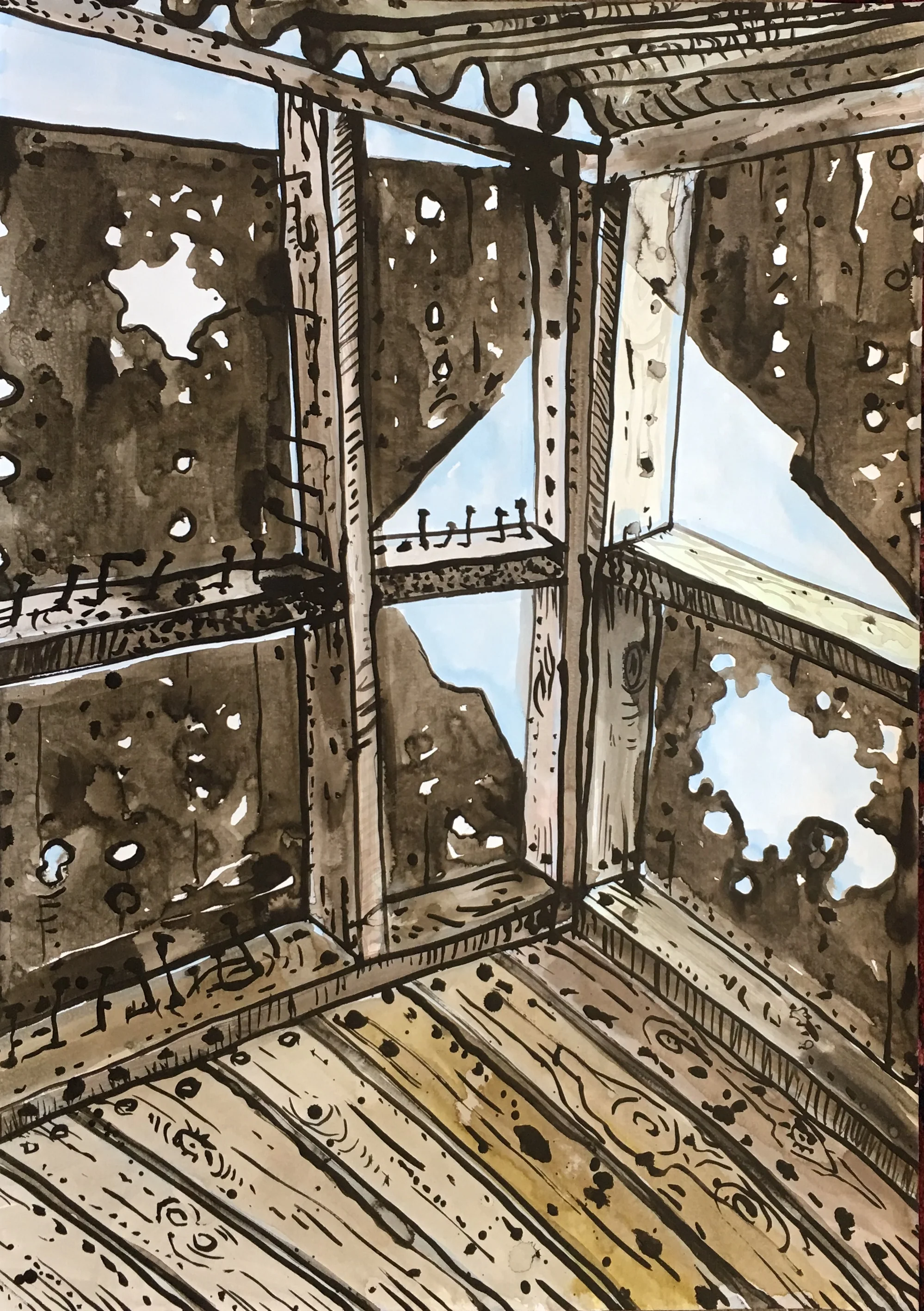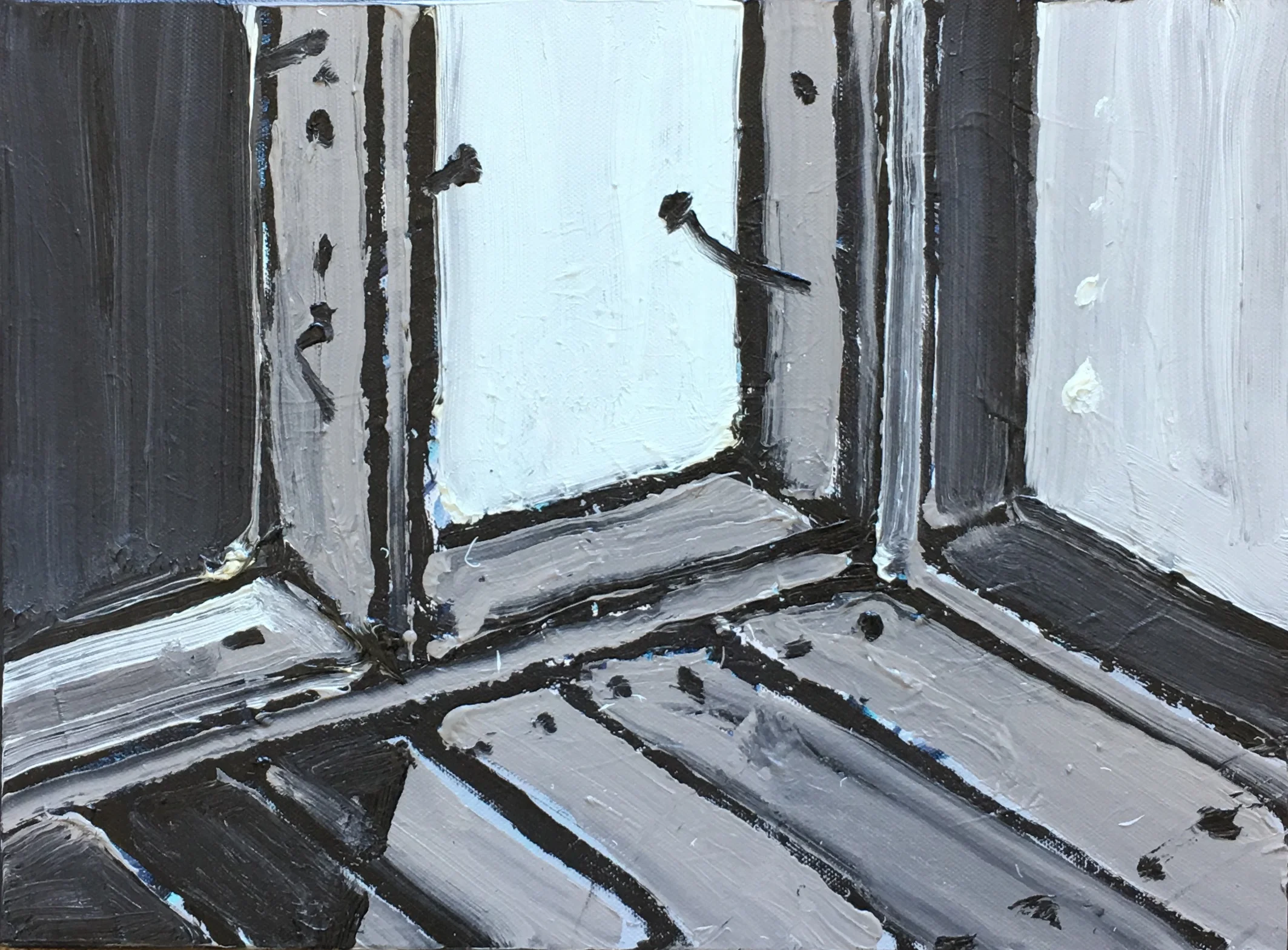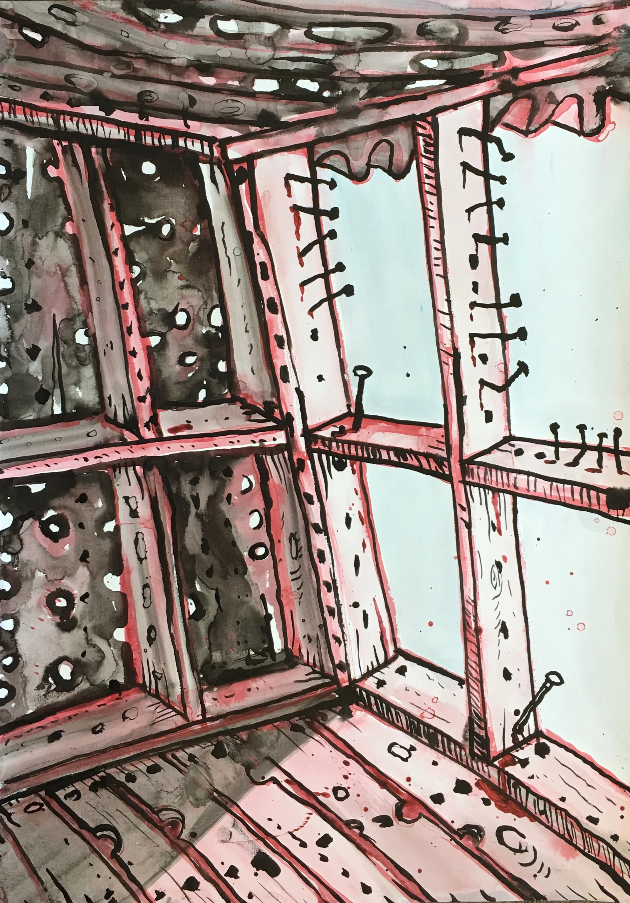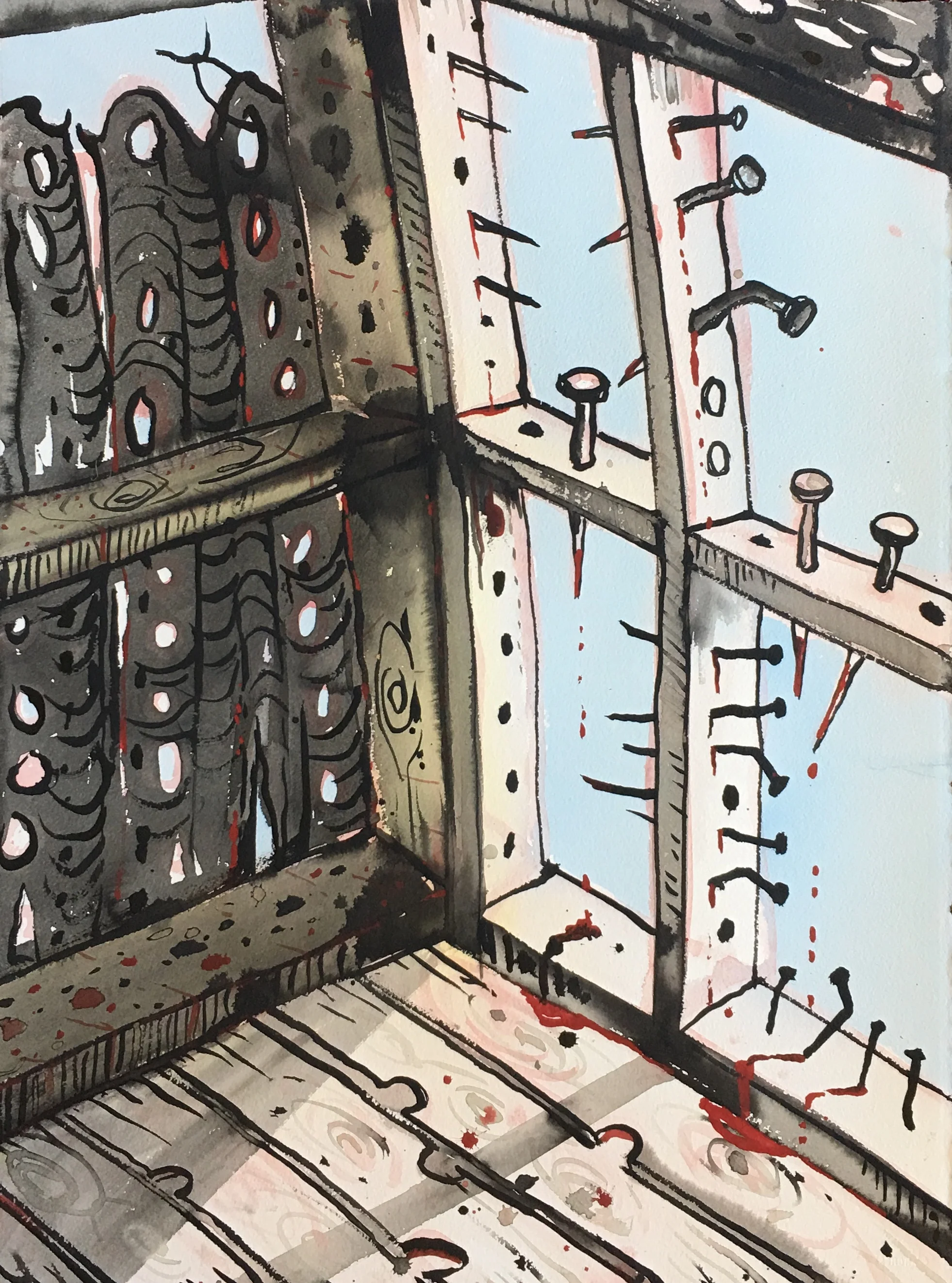 In the current exhibition we are presented with very particular views of parts of sheds and other rural structures. Nails proliferate and are given personalities at odds with their metallic being. There is a sort of naïve directness in the manner in which Taylor configures his images. The faults and flaws that characterise his decaying structures do not seem out of place. Rather they are integral reminders of the processes the walls and floors are undergoing, and indeed invite us to embrace these processes. In a sense Taylor celebrates what once was while pictorializing its decay. There is however an attractive warmth imbued into these works through the artist’s use of soft atmospheric colours and the clever use of black in the outlining of the structures. Taylor has developed his pictorial language to a level of finesse and certitude that speaks of his deep attachment to place and to his concomitant attachment to the activity of painting.