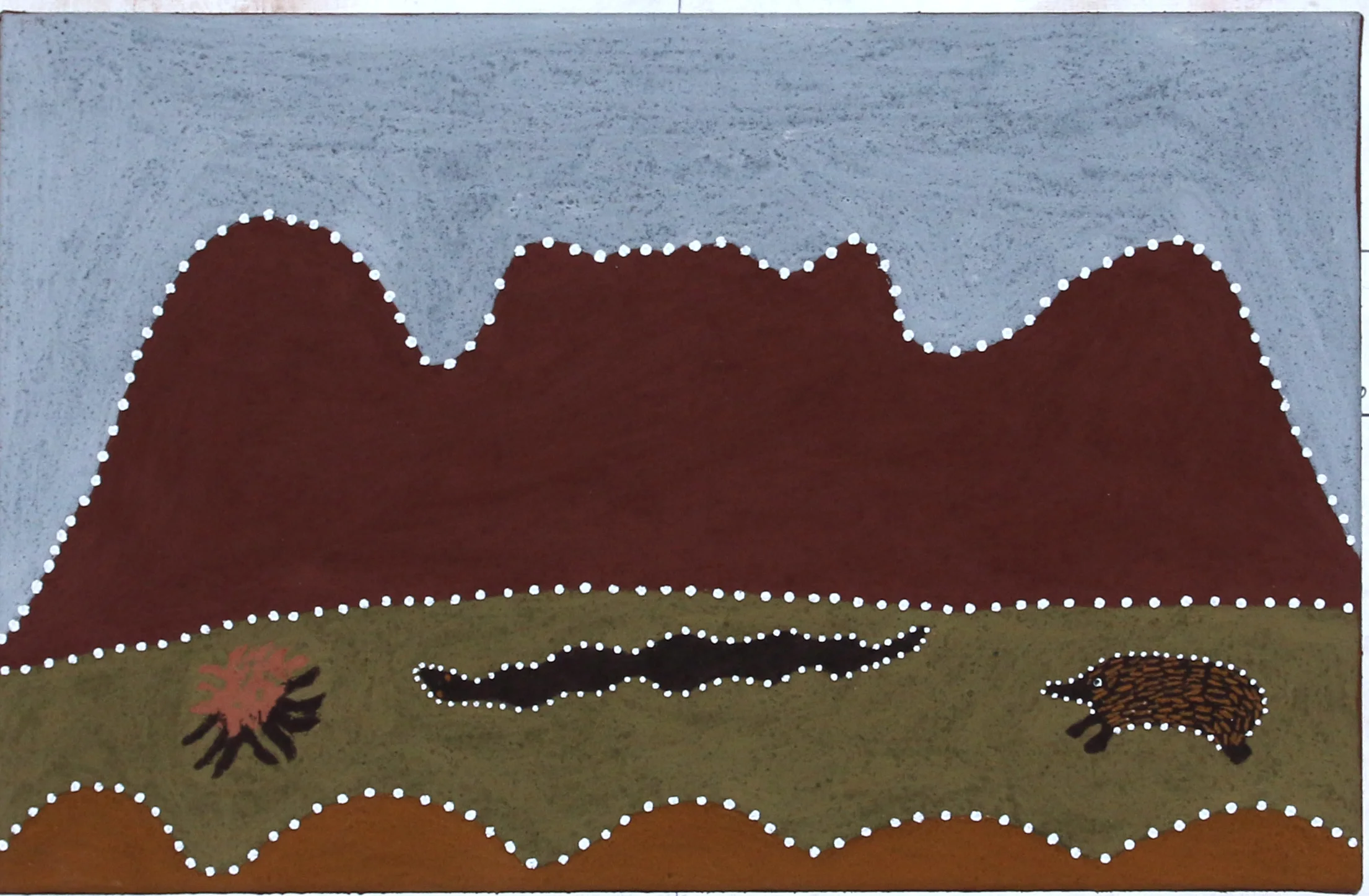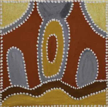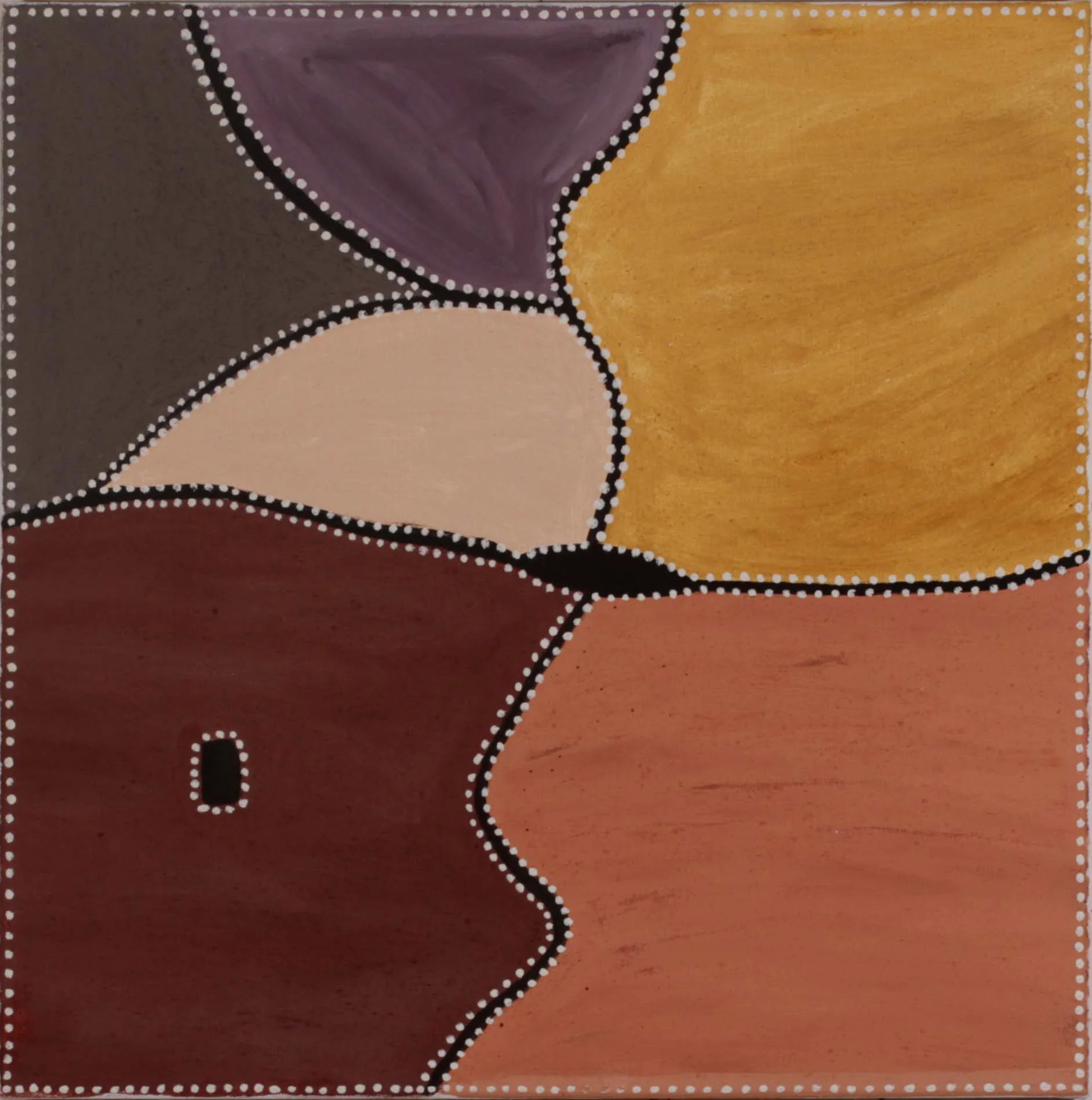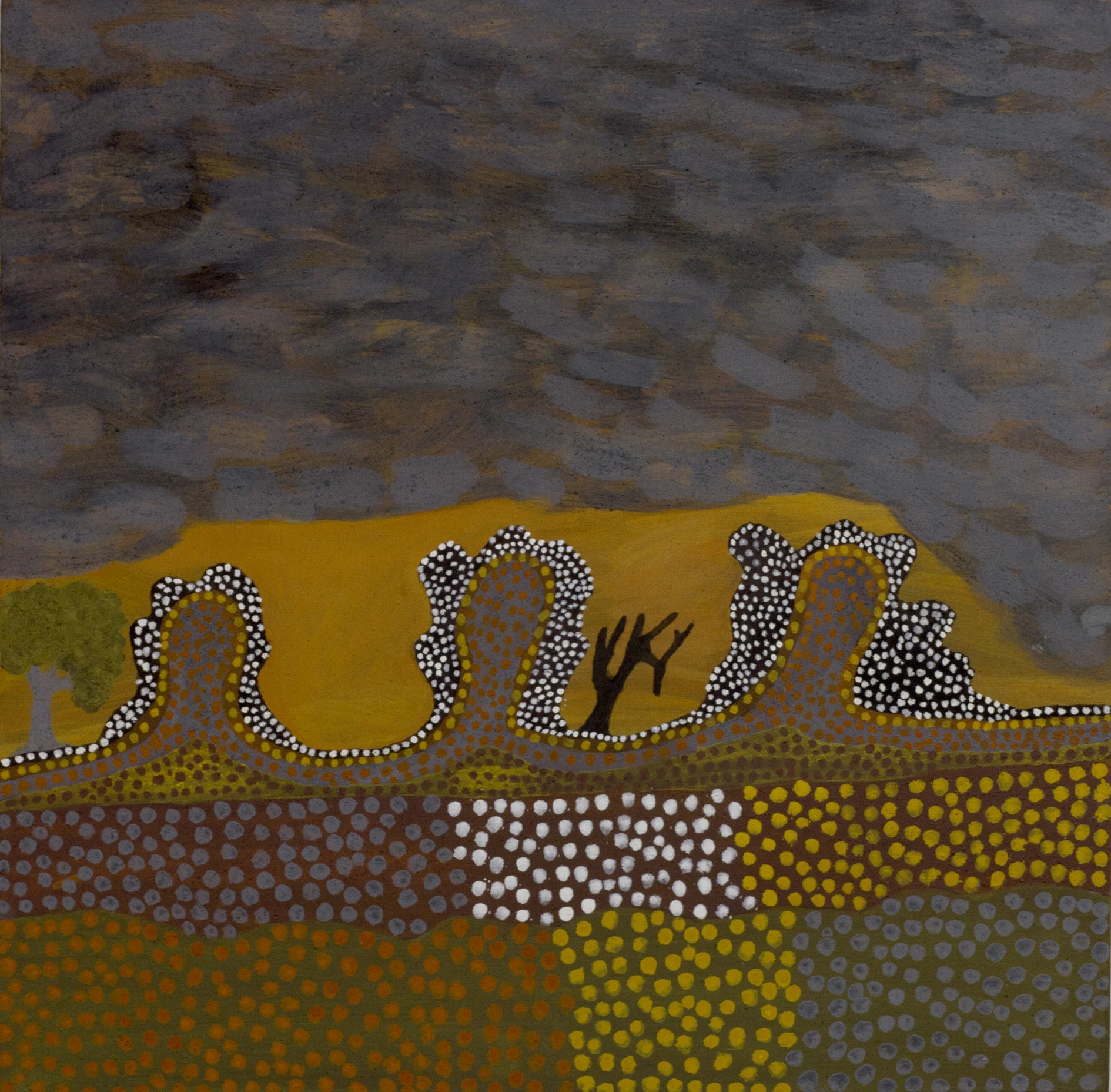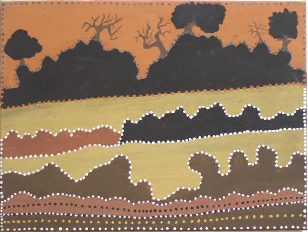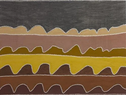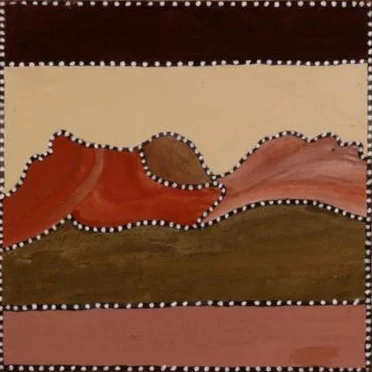 Betty Carrington uses a large range of subtle ochre colours, her delicate palette and style often describing strong and painful stories of historical events in the East Kimberley. One recurring visual reference in her paintings are the rolling hills of her father's country, Darrajayin (Springvale Station). She also paints landscapes from her mother's country, Texas Downs Station, as well as ngarranggarni (Dreaming) places.