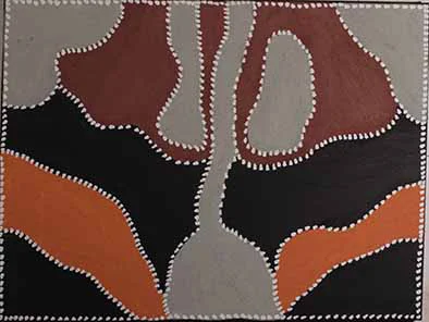 Kathy Ramsay is the daughter of artists Rammey and Mona Ramsay, and the granddaughter of the late Timmy Timms. Of her work she says, "I only started painting in 2013. I like to join in and to be sharing a part of my Country. My mother and my grandfather always told us what this place means, what the names are, and all those Ngarranggarni (Dreaming) stories. Now, with all this painting, I'll be the one to tell them to my kids. I just paint what my old people told me about our Country – because they are the ones who know the history of our Country, the Country we’re still connected to today. Our Country really knows us, and it owns us’. Kathy paints her ancestral Country around Bow River, incorporating rich Ngarranggarni stories with recent histories of station life.