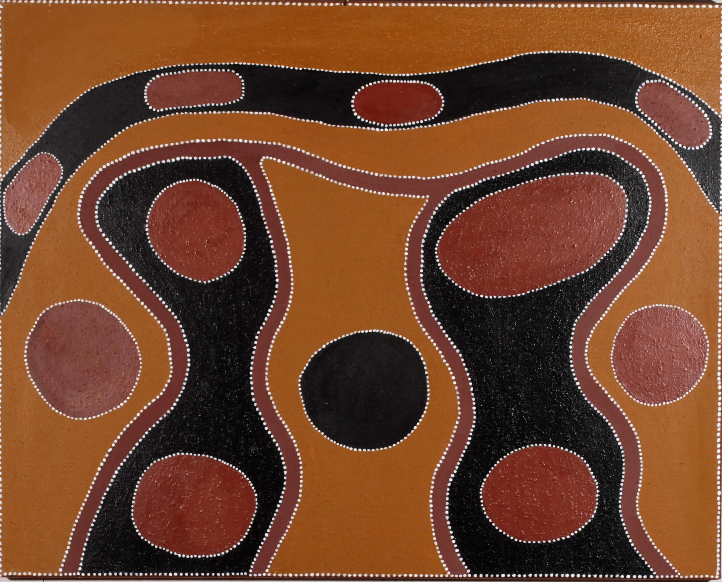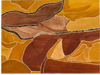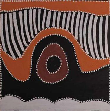 The paintings are at once geographical, historical and biographical. Country is mapped with ochre to illustrate the present and the past- the artists’ personal lives and those of their ancestors. They present a rich tapestry of narratives that reveal the ngarranggarni (Dreaming). Natural forms and geographic locations articulate cultural histories. Features in the landscape such as hills, trees, rocks, waterholes and rivers appear as motifs but, in fact, represent the history of the land.