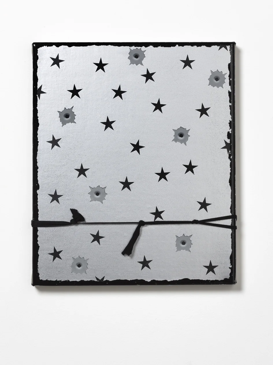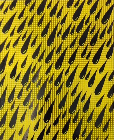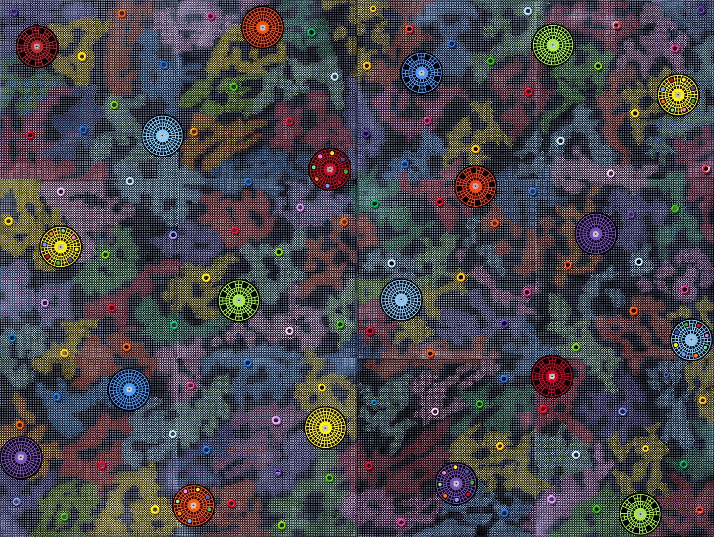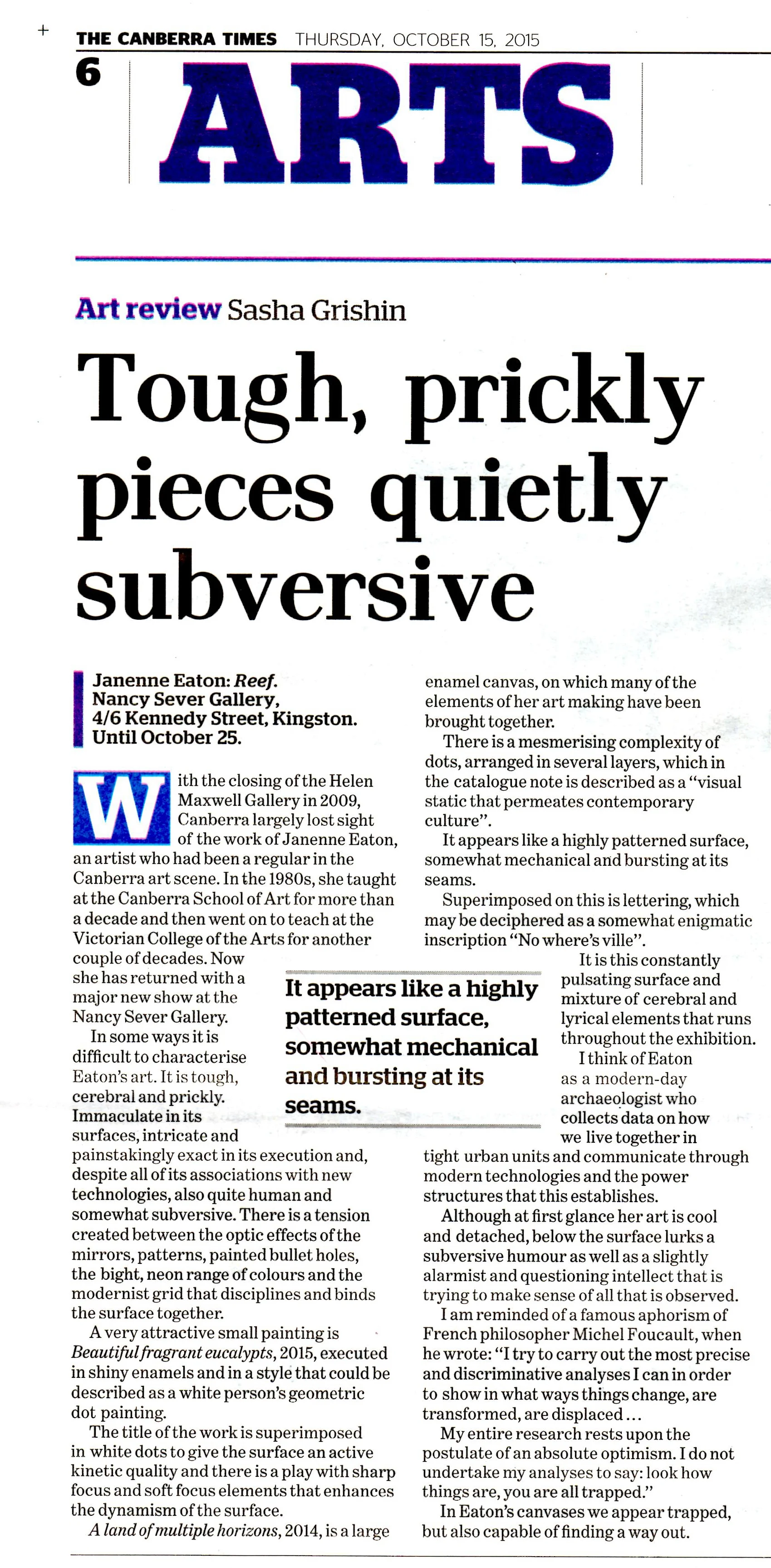 'Janenne Eaton is well known for glossy abstract gridded paintings that, in their complex navigation of surfaces and depths, turn our attention to political and social terrain(s). In this new series of work, Reef, Eaton extends her usual engagement with the virtual ‘grid’ by making more explicit reference to early textile samplers, quilts or weavings, in which stitched squares are commonly joined to form one pattern or image. In these new works, intensely coloured bright dots, lines and scrawls jostle, pour and hover within reflective black squares. This powerful play between the energy of the hand and the holding structure of the ‘grid’ brings a stimulated attention to the surface that somehow forces us to look beyond it. Via the title work Reef, we become attuned to the precariousness of our ocean environment, threatened with destruction. Eaton provides us with an abstract, textural aerial view of brightly coloured coral, and pictures us in relation to it. She references the active work of the hand, via delicately crafted framed mirrors and mandala like decals adorning the surface of the paintings. The mirrors operate as holes or gaps, suggesting a deep space underneath. As we move closer to see what might be there, we find ourselves. Other works feature bullet-holes on a pink surface, Posca filled squares, an angry slur of text, and bleeding holes of rainbow paint. With each vibrant and technically masterful work, Eaton punctures and opens the painterly space in a new way. This interrogation of the surface is beautiful and political. In Eaton’s hands, painting and the world beyond it is a richly coloured, complex tapestry and we are offered the privilege of looking more closely'. [1]