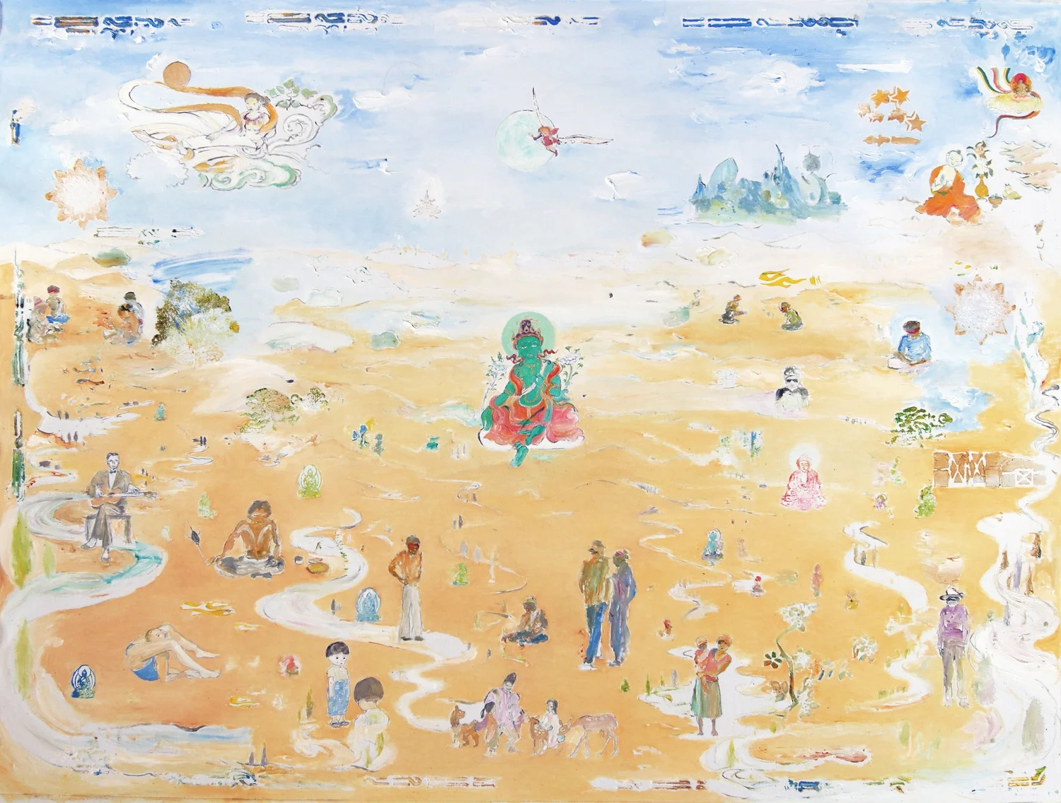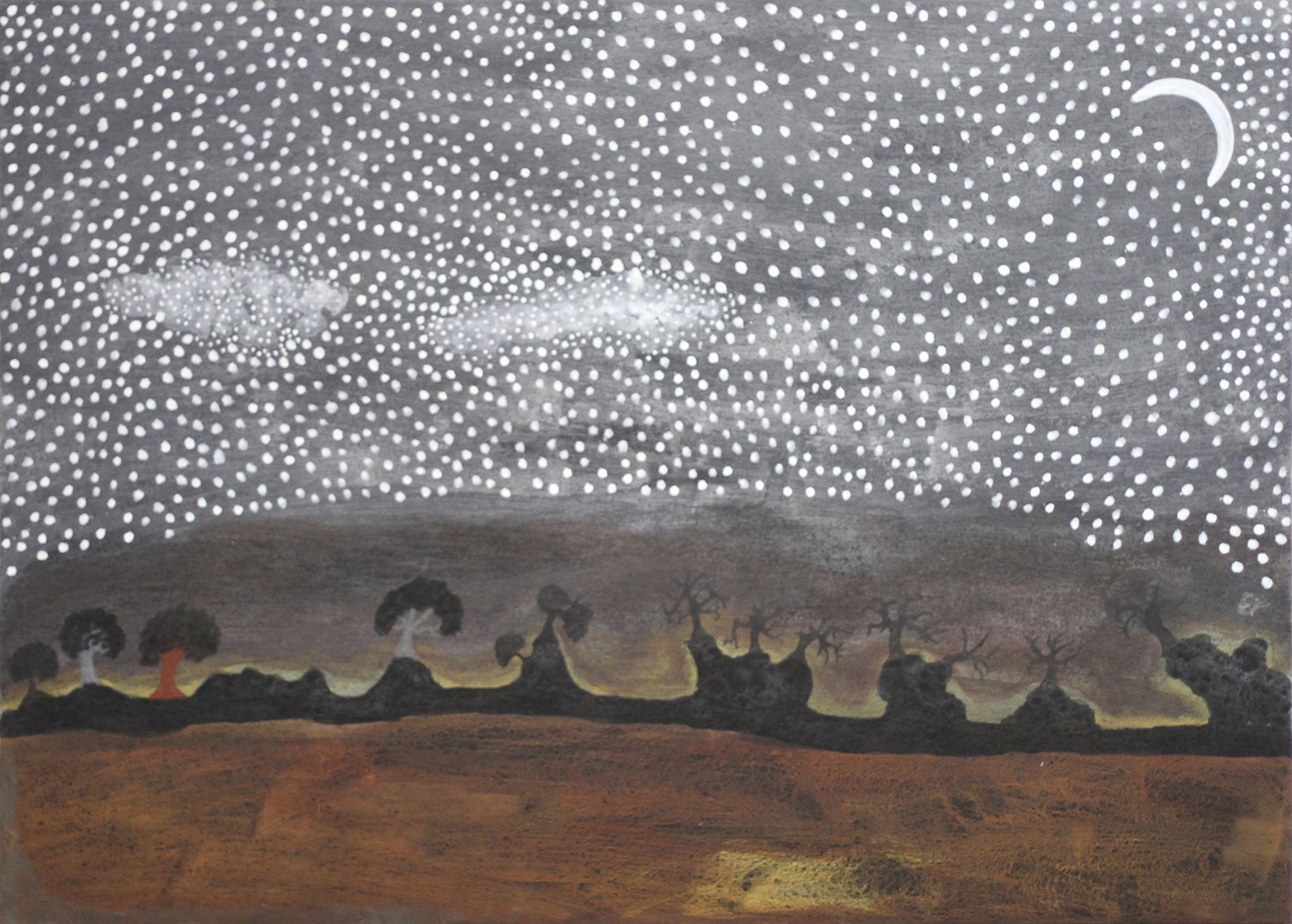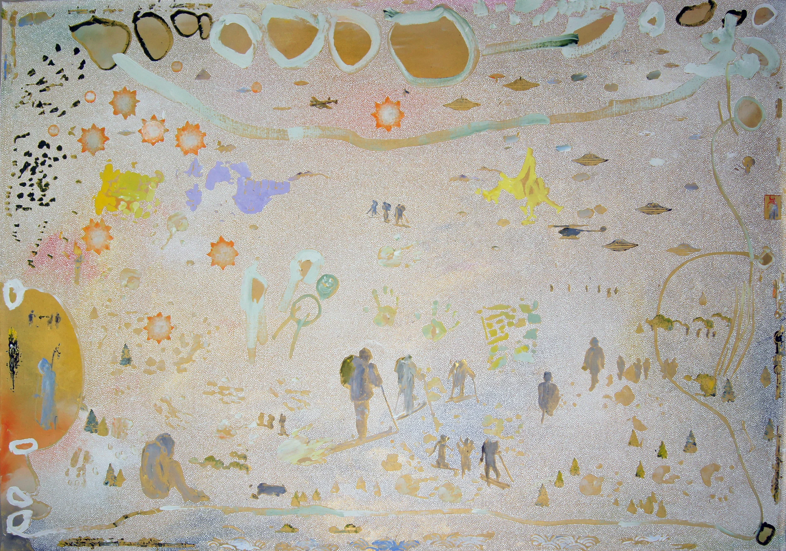 Often described as ‘floating worlds,’ Tim Johnson’s extraordinarily powerful paintings embrace the spiritual iconography of a range of cultures including Aboriginal, Buddhist and Tibetan. They are landscapes of desire, imagined syntheses of cultural and visual systems that freely draw upon images that are charged with meaning. The paintings are hypothetical landscapes.