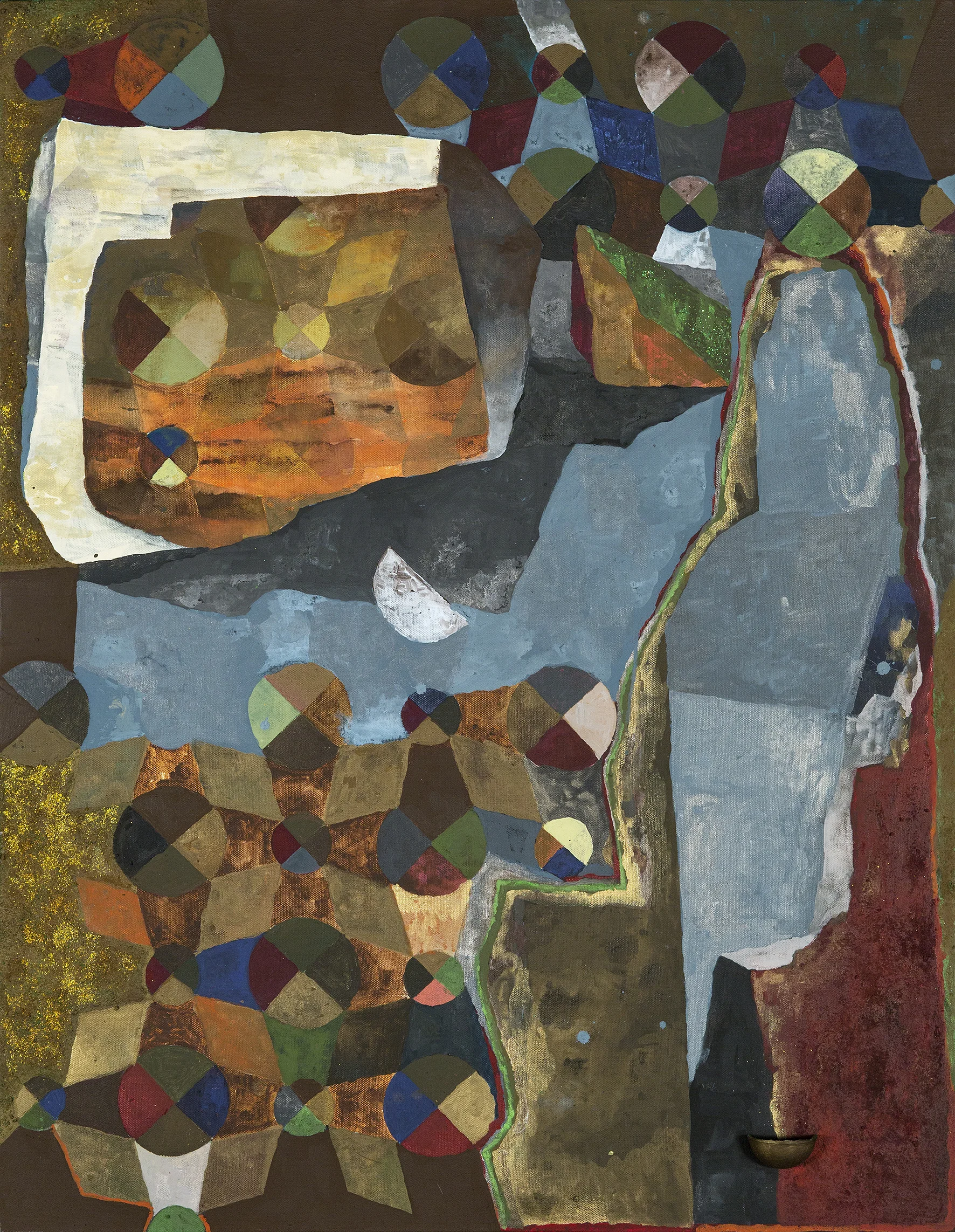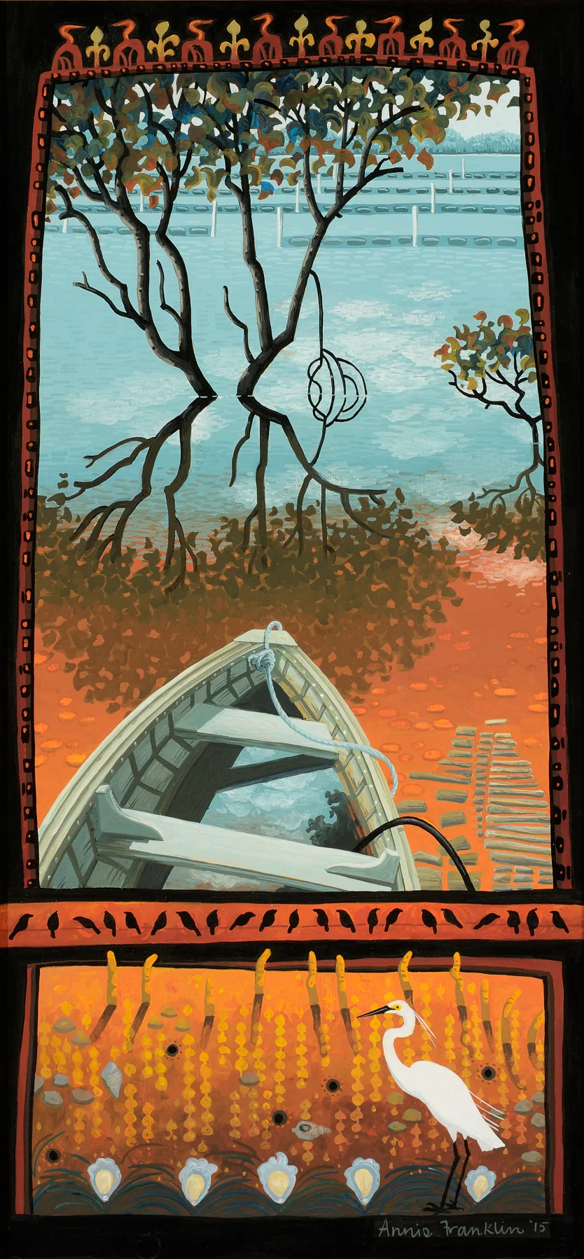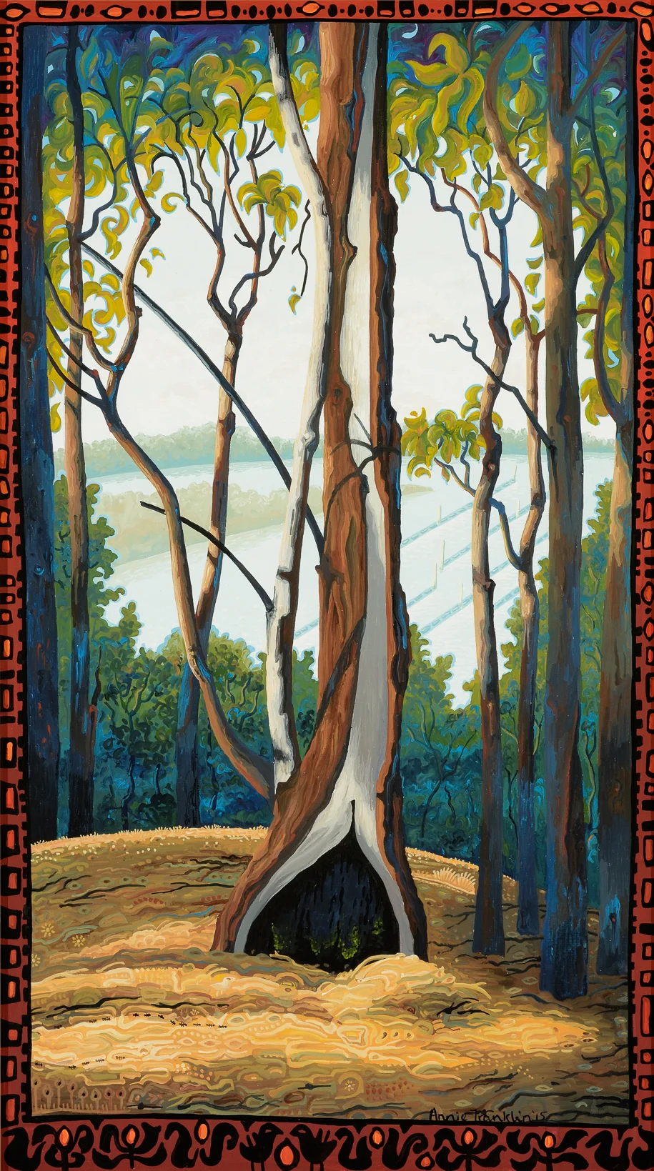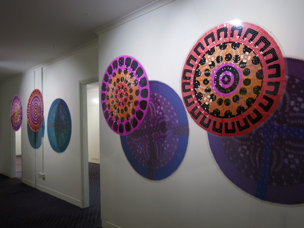 Often described as ‘floating worlds,’ Tim Johnson’s extraordinarily powerful paintings embrace the spiritual iconography of a range of cultures including Aboriginal, Buddhist and Tibetan. They are landscapes of desire, imagined syntheses of cultural and visual systems that freely draw upon images that are charged with meaning. The paintings are hypothetical landscapes.