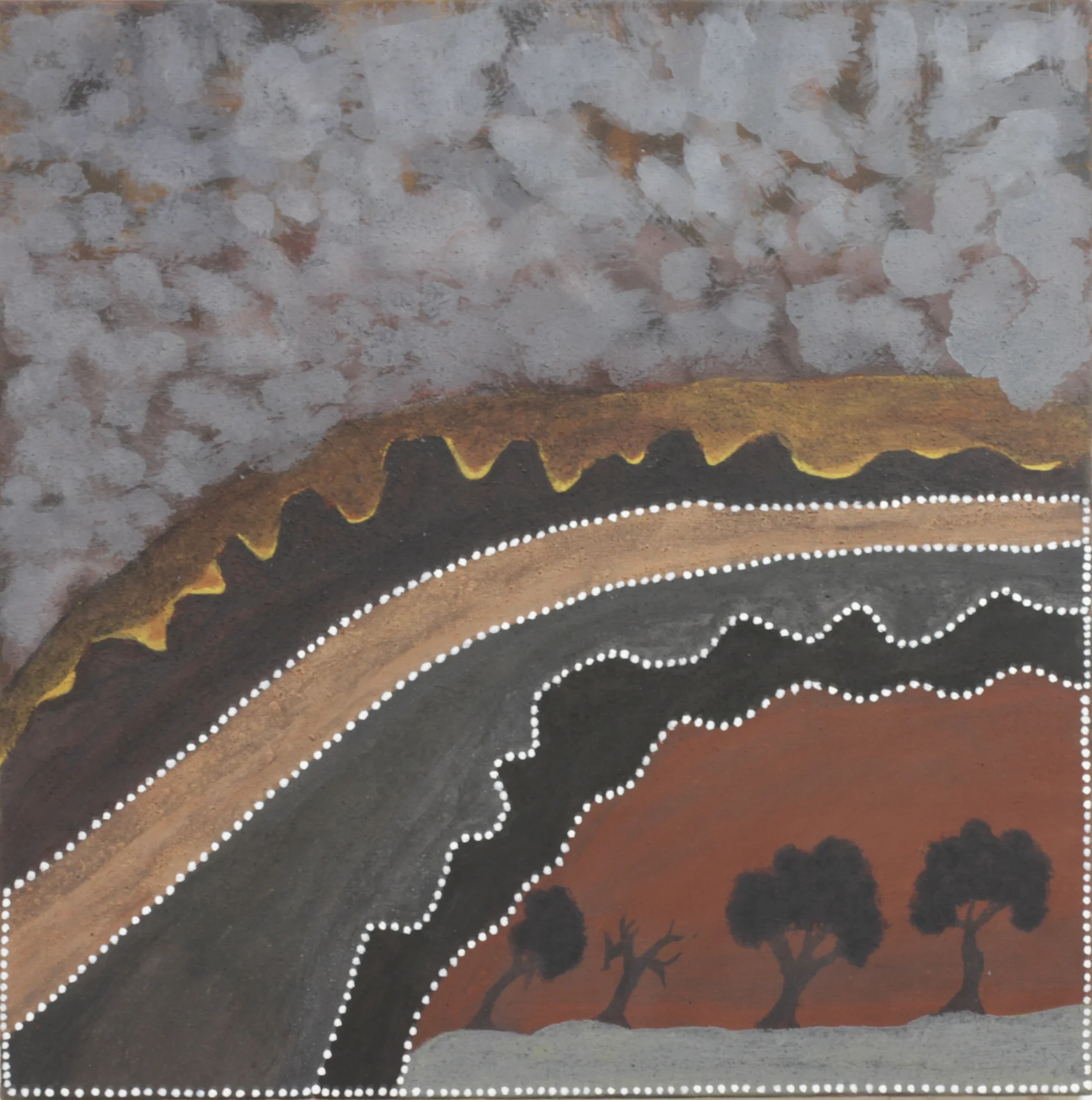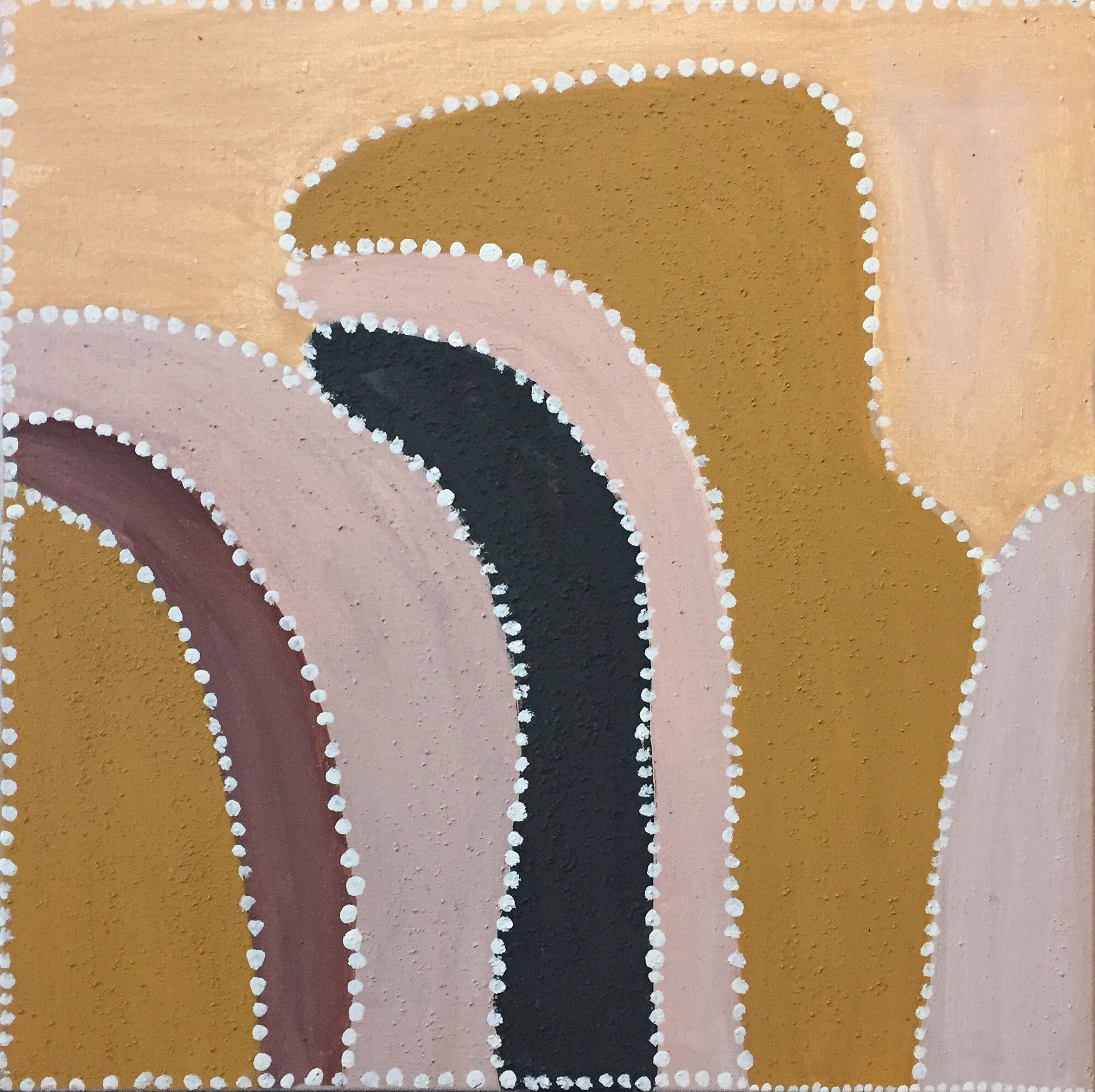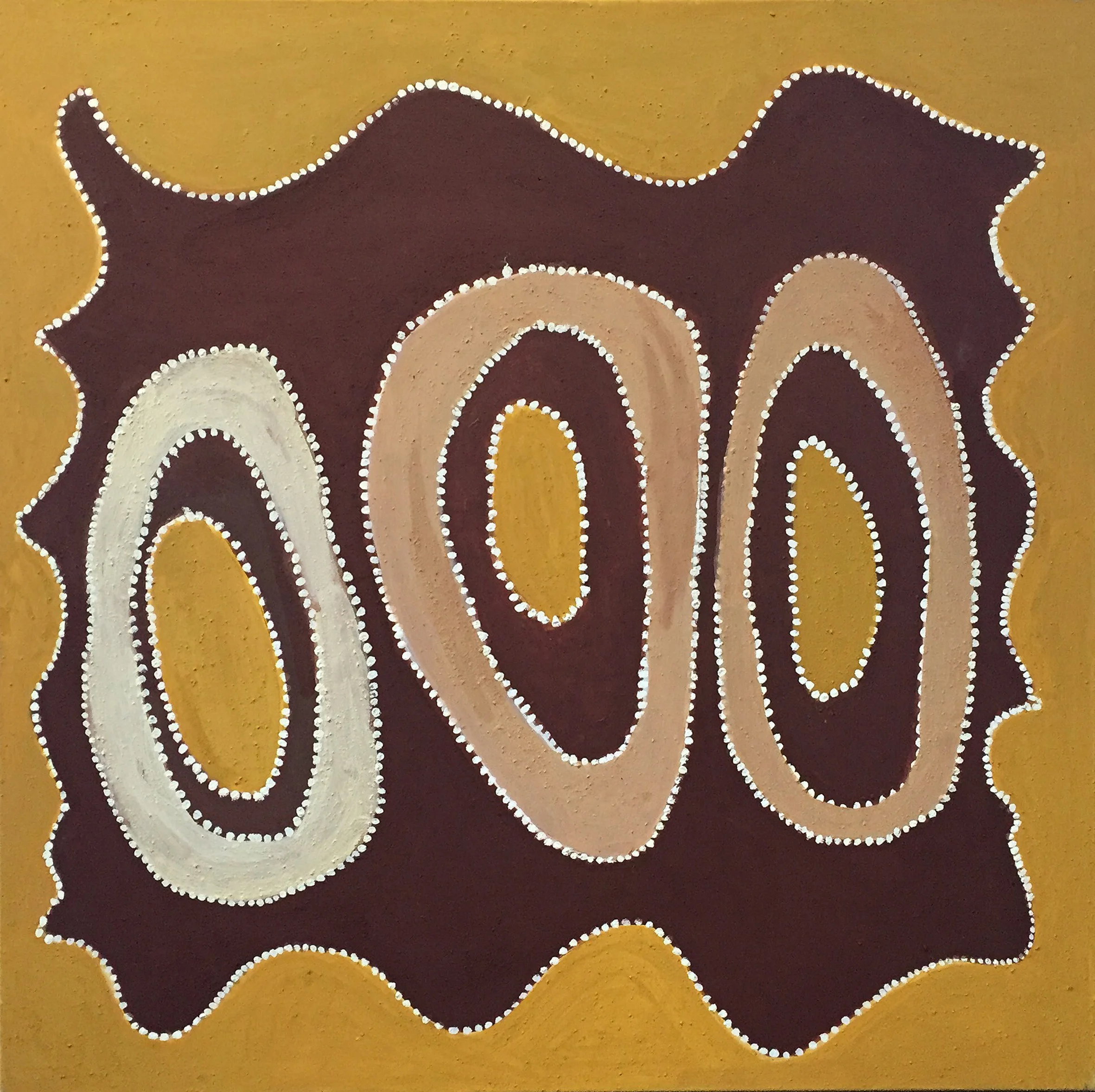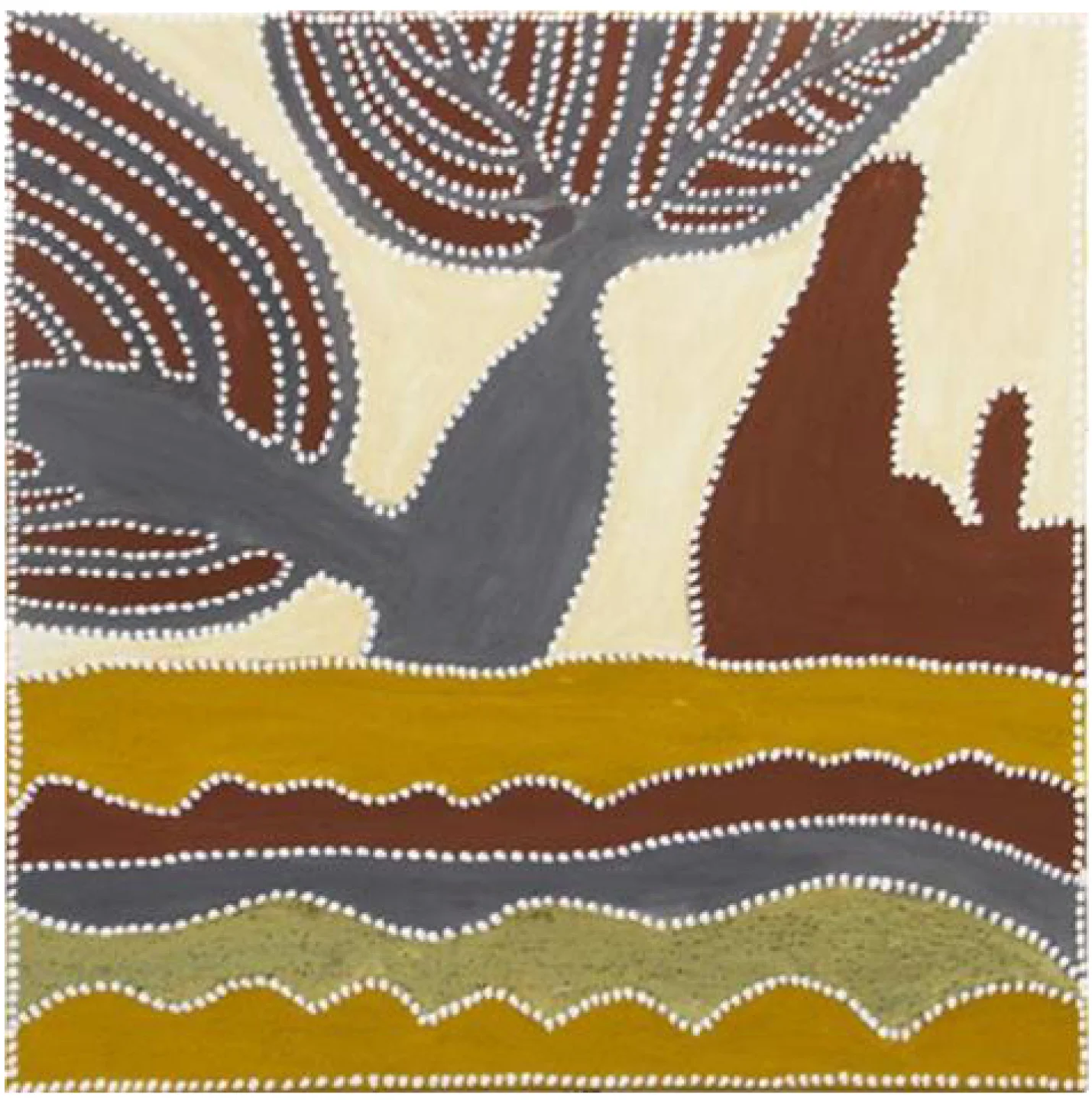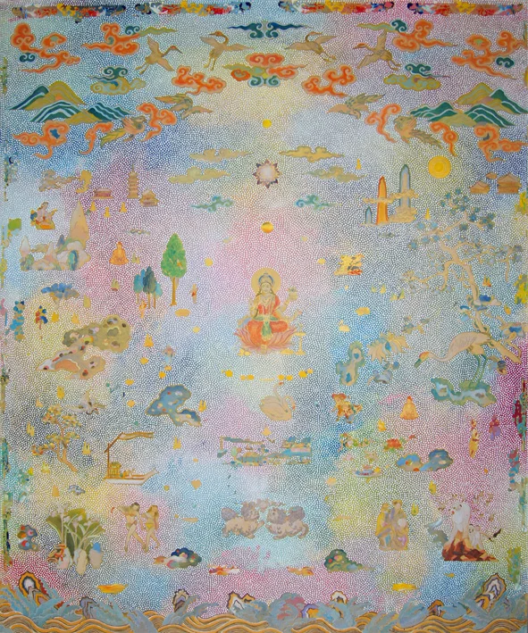 The dot painting of Papunya, a Tibetan thanka or Radio Birdman logos - may all find their place in his work. His painting style is influenced by these sources in both a technical and philosophical way, and by his collaboration with artists from these cultures. Tim Johnson has collaborated with Clifford Possum Tjapaltjarri, Michael Nelson Jagamara, Karma Phuntsok and My Le Thi, among others.