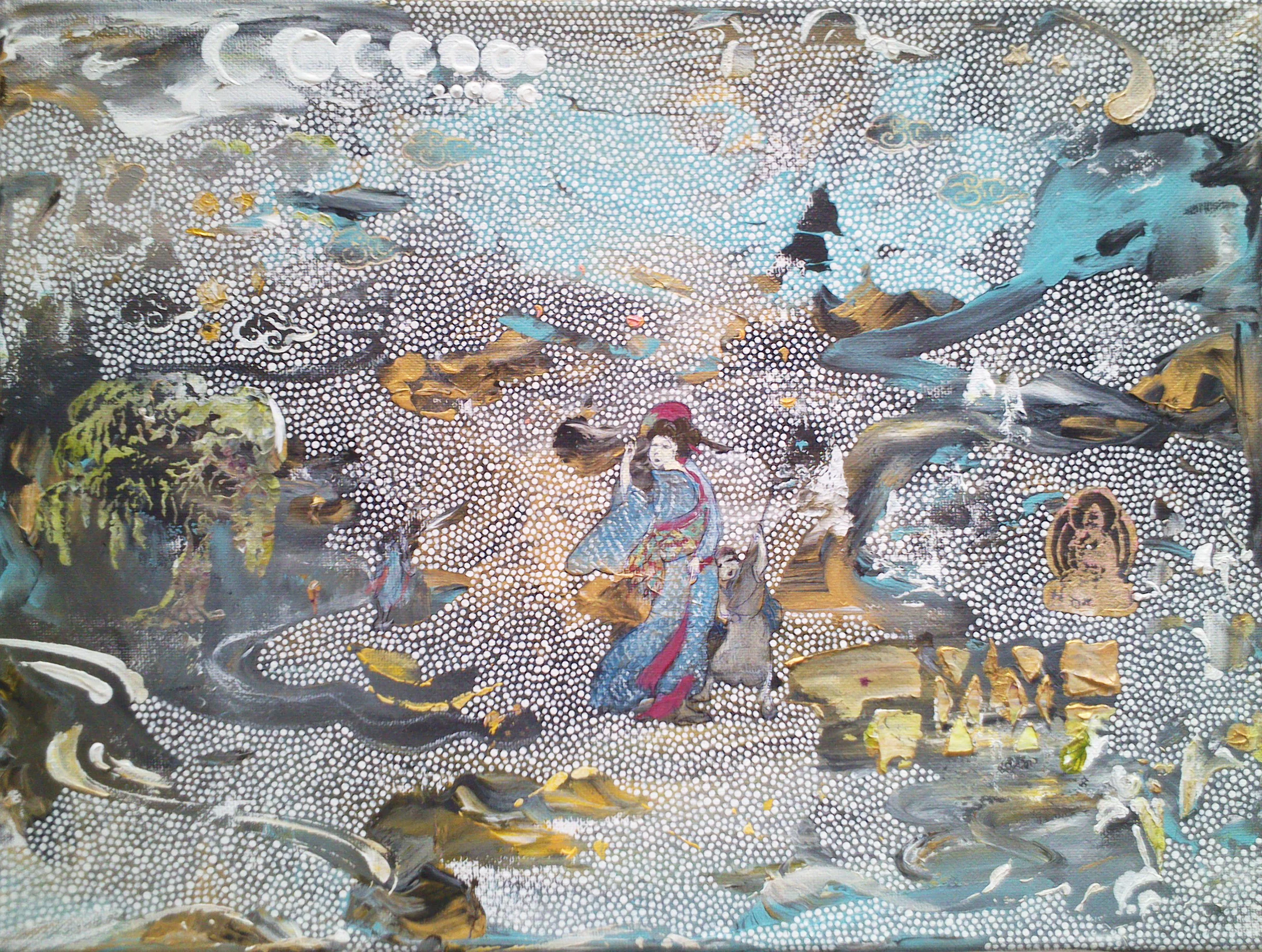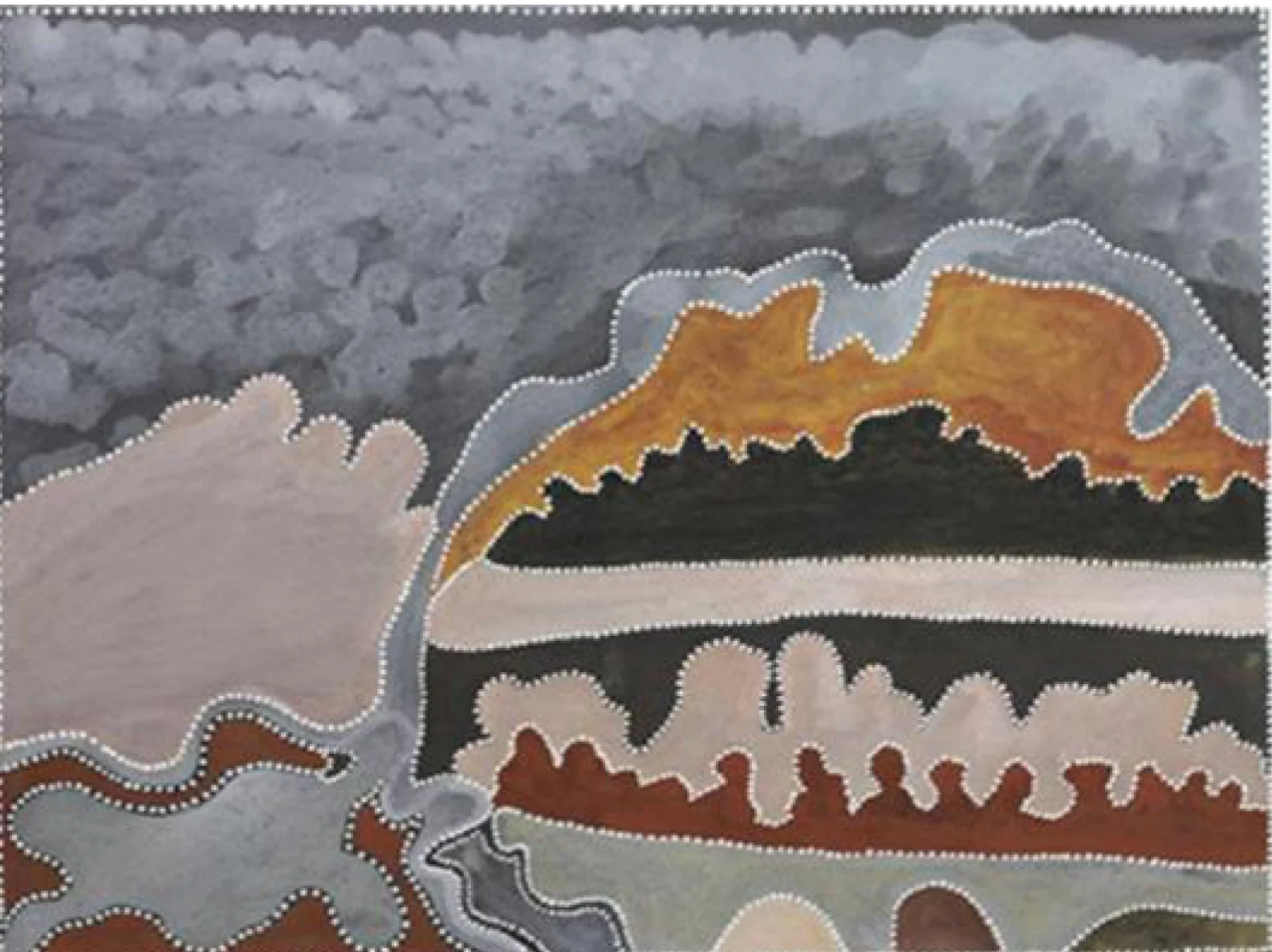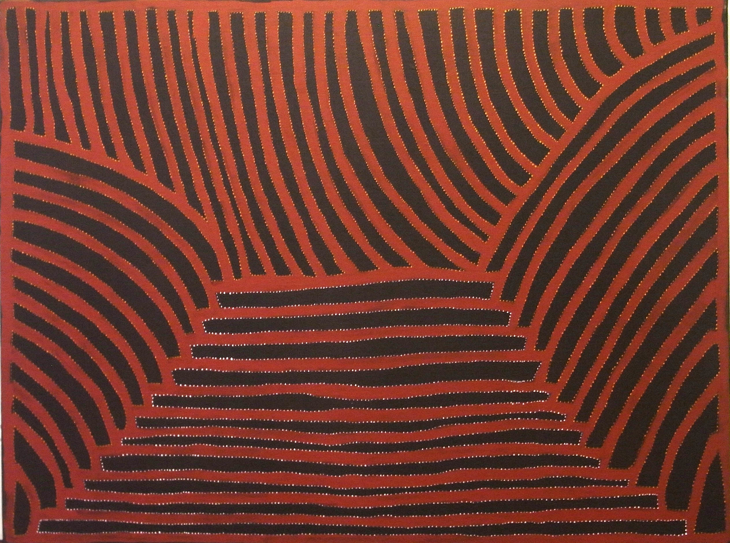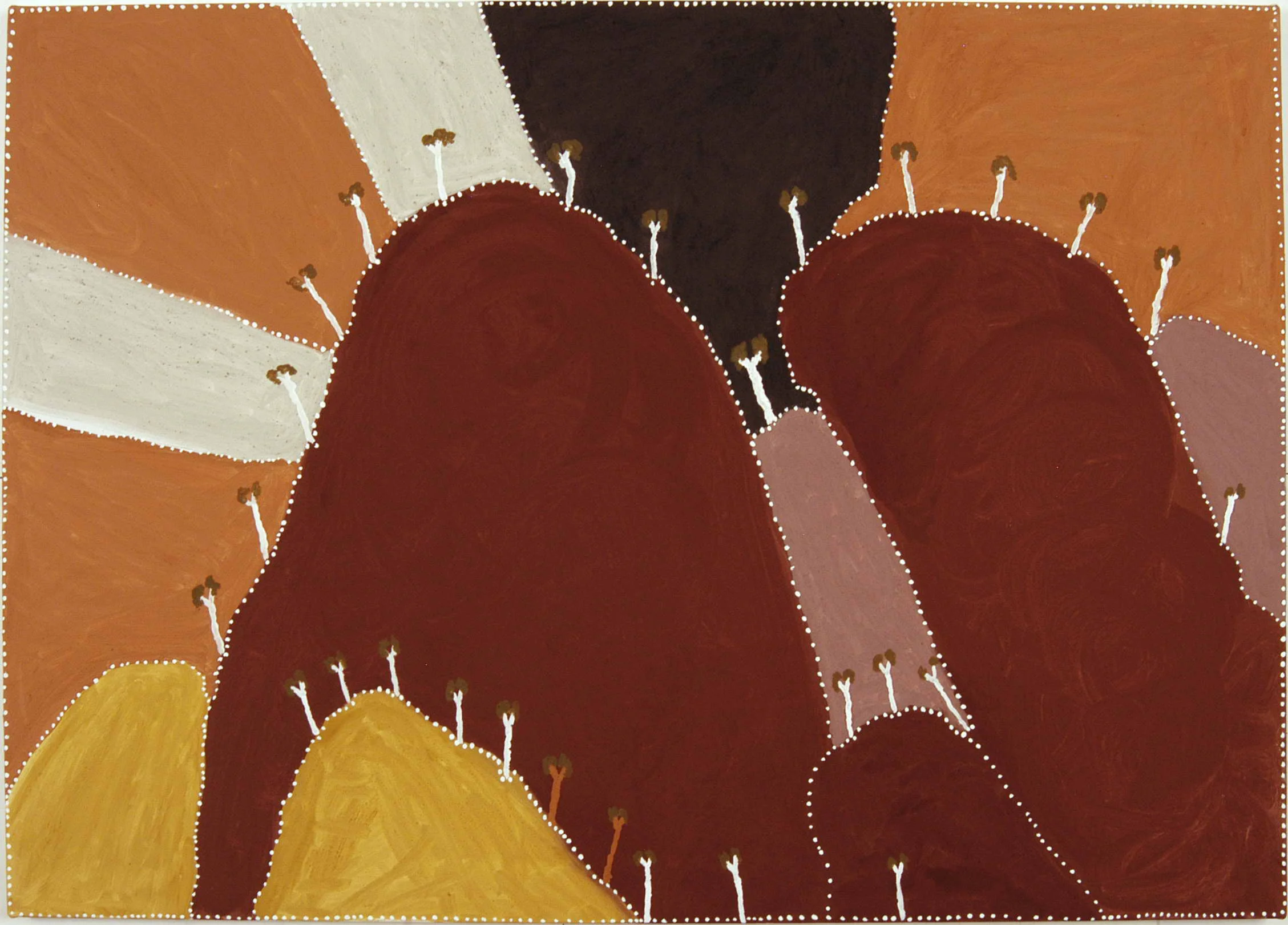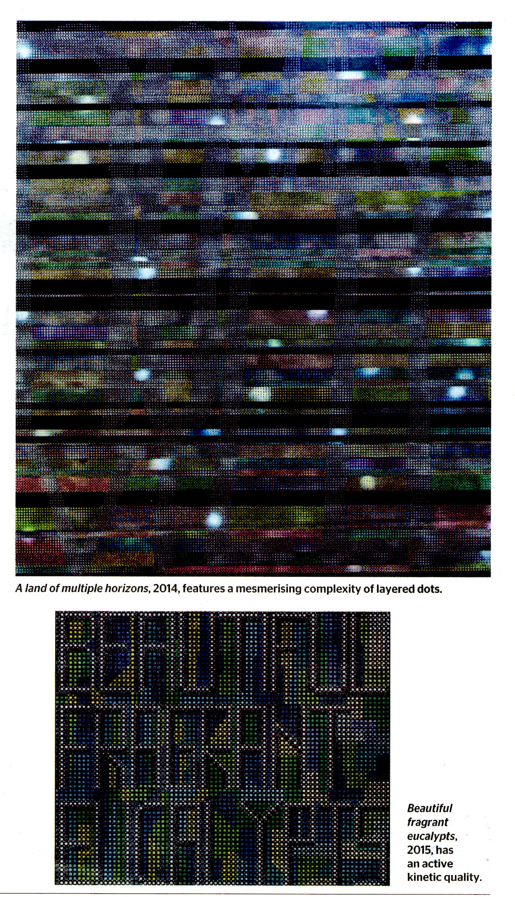 The dot painting of Papunya, a Tibetan thanka or Radio Birdman logos - may all find their place in his work. His painting style is influenced by these sources in both a technical and philosophical way, and by his collaboration with artists from these cultures. Tim Johnson has collaborated with Clifford Possum Tjapaltjarri, Michael Nelson Jagamara, Karma Phuntsok and My Le Thi, among others.