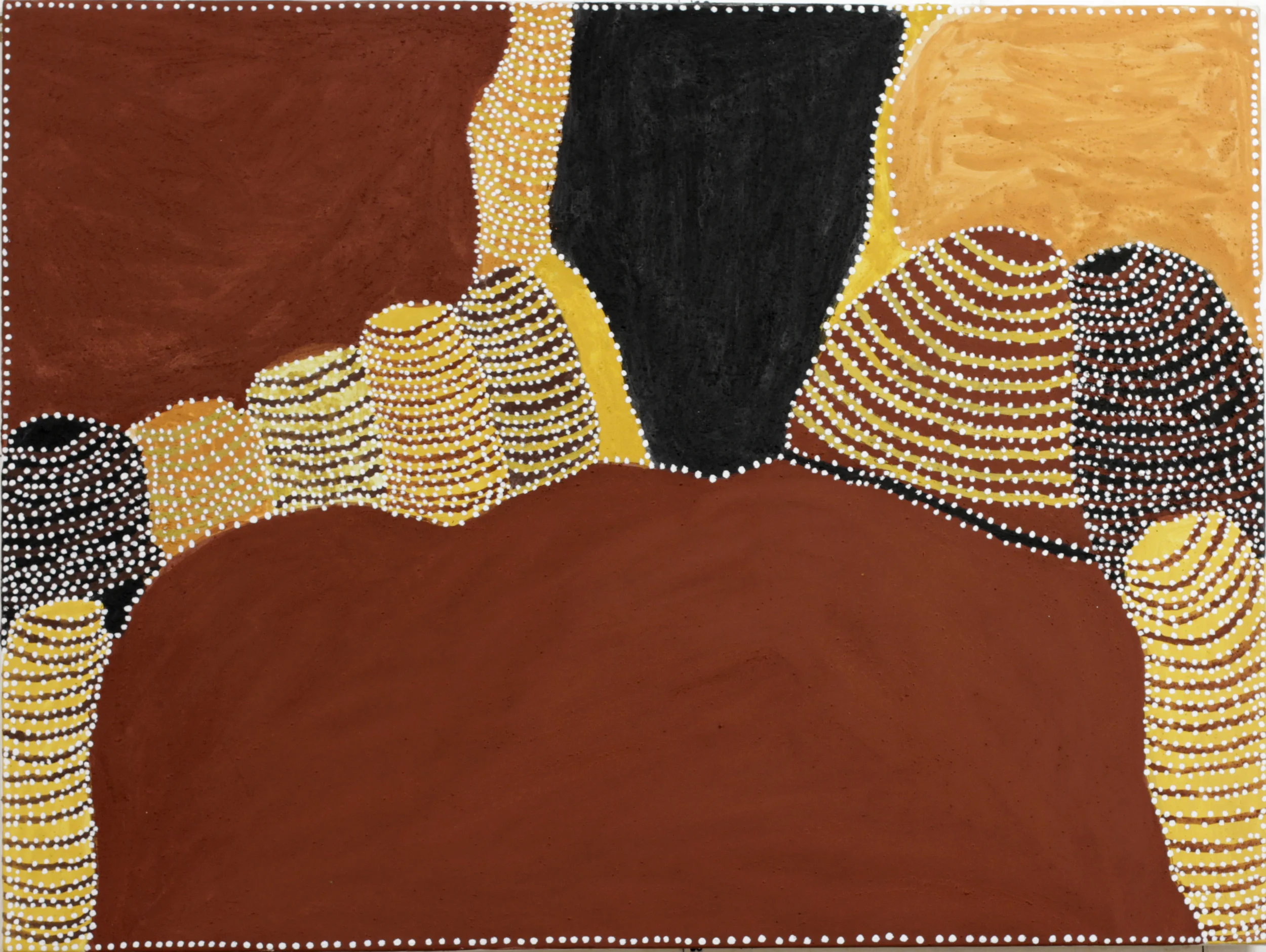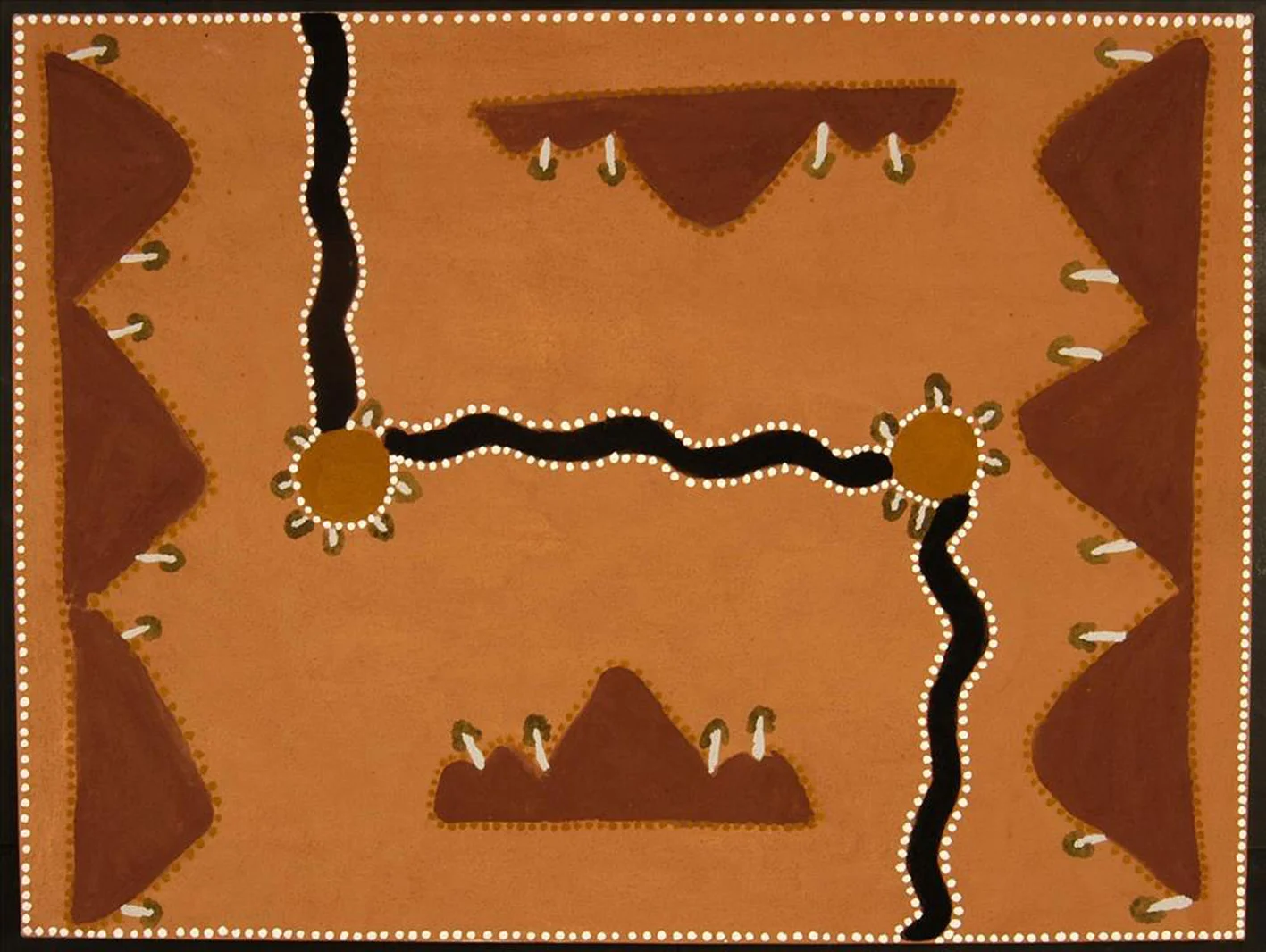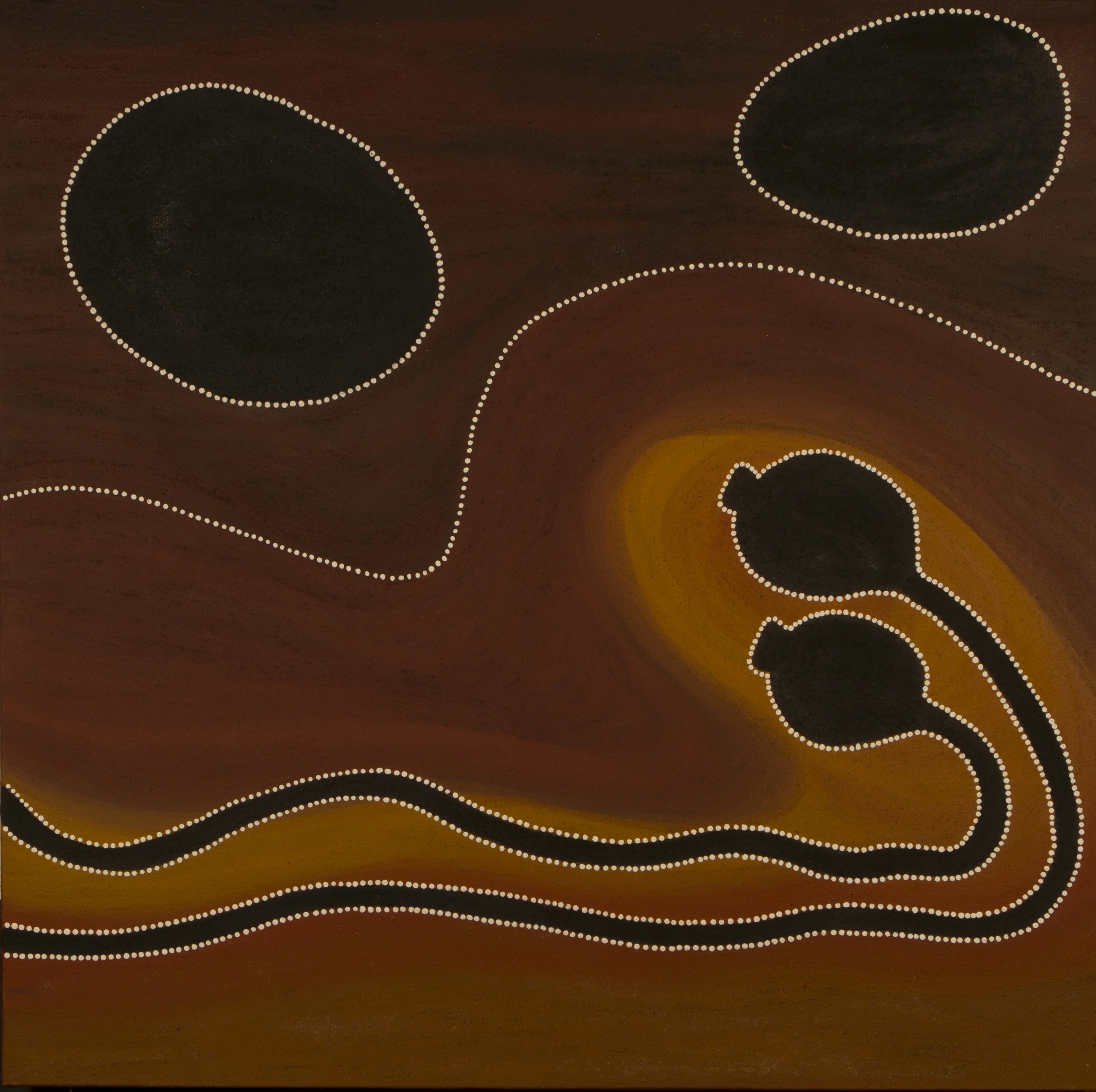 From the remote regions of Western Australia and the Northern Territory comes the art of four of Australia’s leading indigenous artists. Caring for Country presents paintings by Queenie McKenzie, Freddie Timms, Gloria Petyarre and Dr. George Tjapaltjarri. The four share a love of their traditional lands and a respect for the way their country has nurtured them. Their art shows how they draw spiritual and physical sustenance from country and turn to it for spiritual and physical healing.