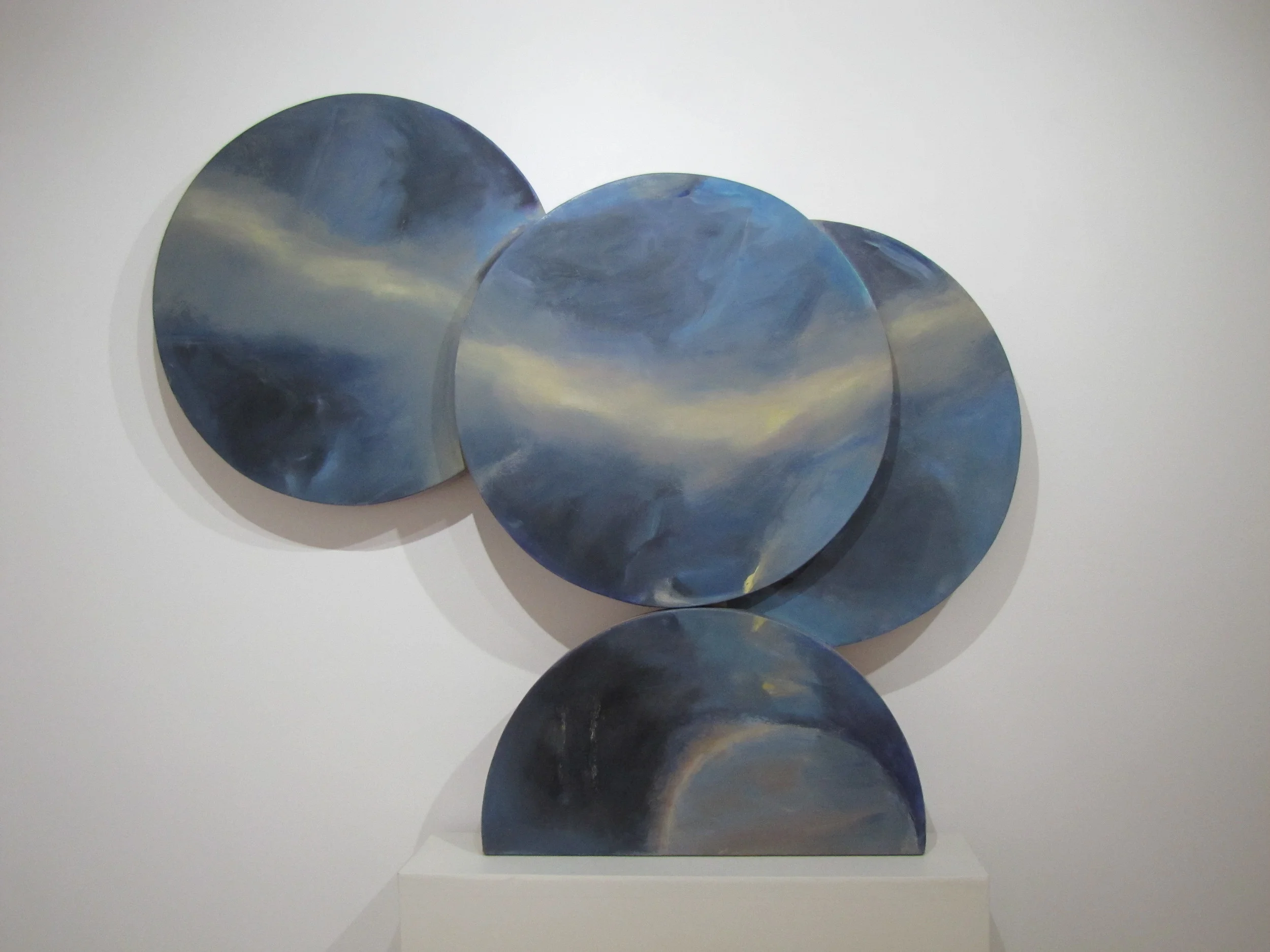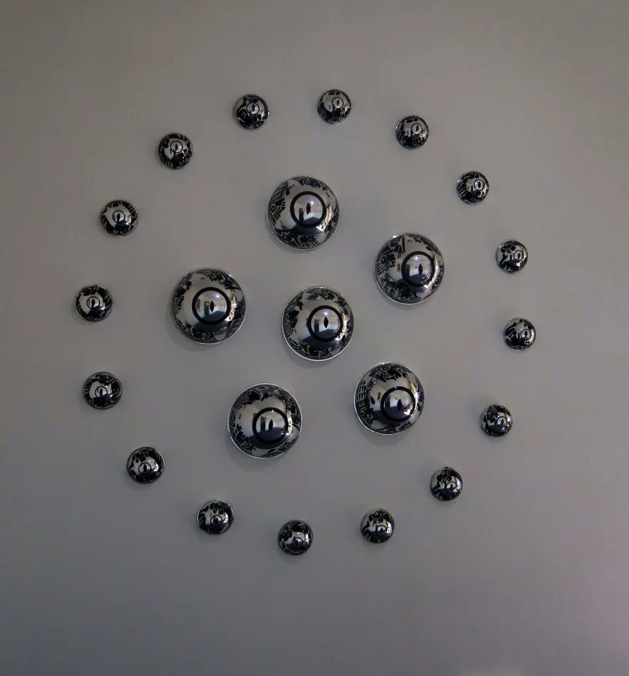 The car as icon has a long tradition in Mexican culture, where the artist’s roots lie, and she uses the car and its parts as a vehicle for exploring her cultural heritage. Components that are peripheral to the functioning of the car become devices for looking at everyday objects in a different way: a windshield, a rear vision mirror or, in this exhibition, hub caps. Removed from their usual context these car parts become objects in their own right. By decontextualising them, the artist creates a new aesthetic that occupies the middle ground between popular object, art object and conceptually complex artwork.
