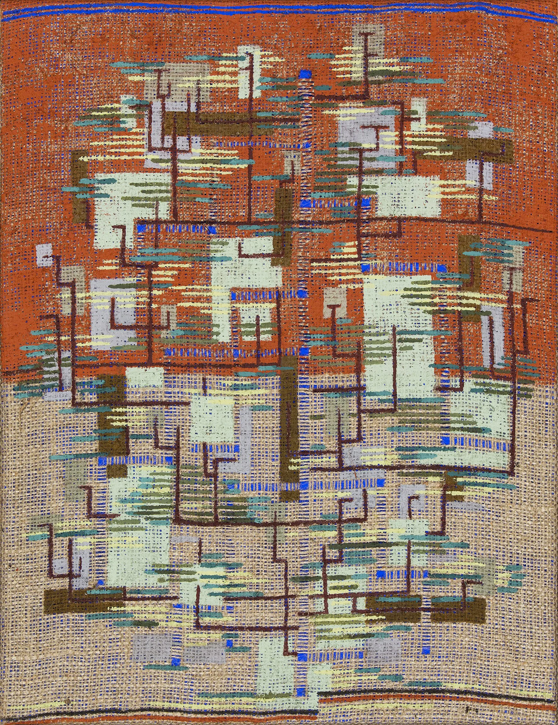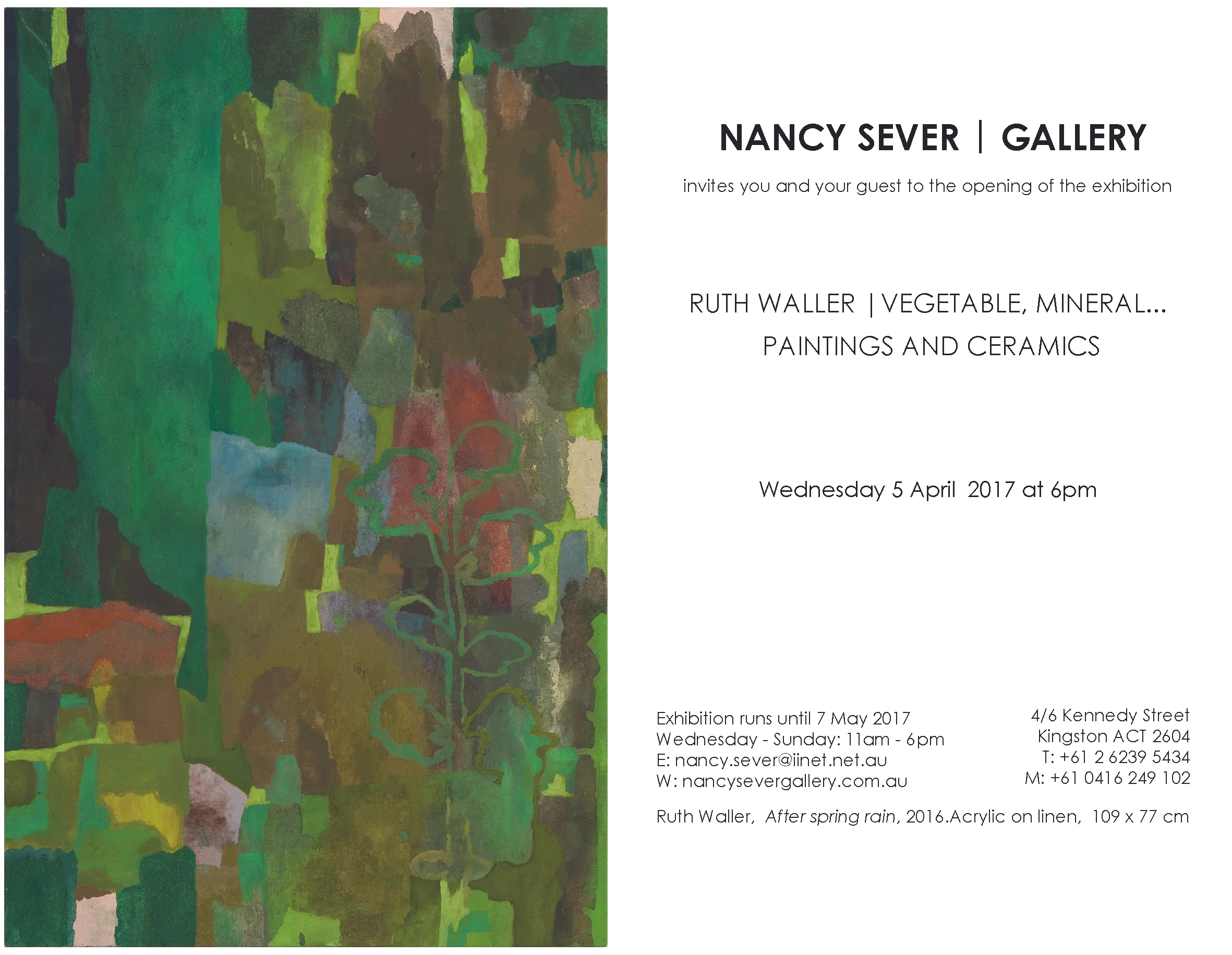 Most recently Waller has returned to exploring the natural world through painting, specifically the botany and geology of her own garden and of the local bushland. She speaks of finding new pleasures and possibilities in considering paint as a kind of mineral matter: of colour as a gritty and particular substance, enjoying the way rocks form and cleave with planar geometry and yet erode and crumble in ways more organic, each being irregular and unique and shaped by a specific series of events in the world.