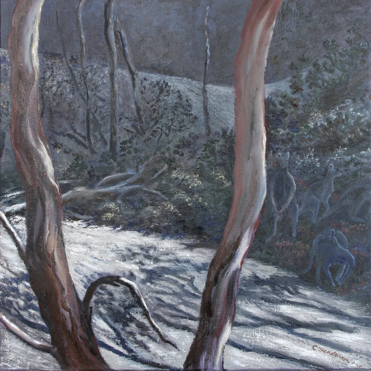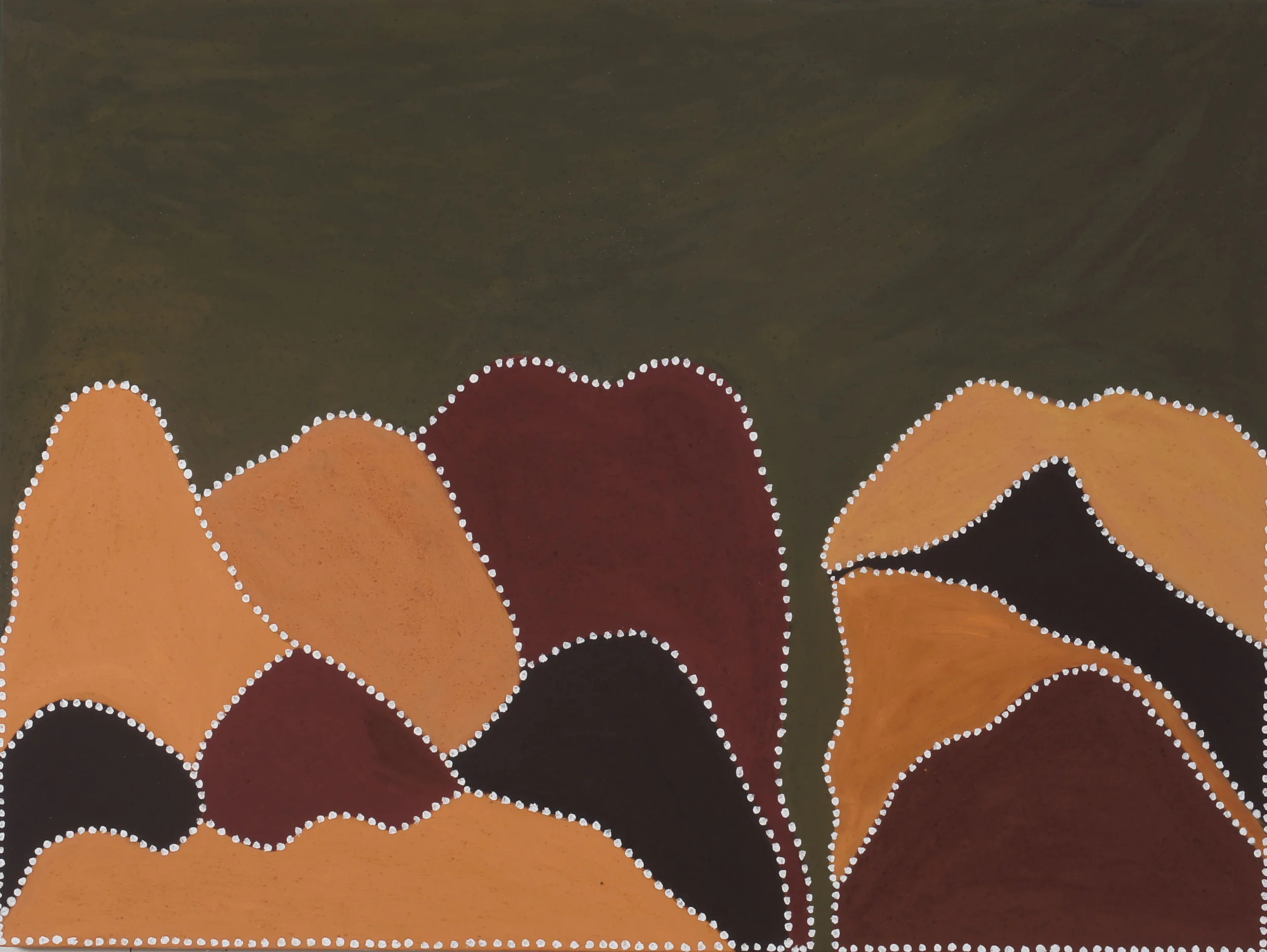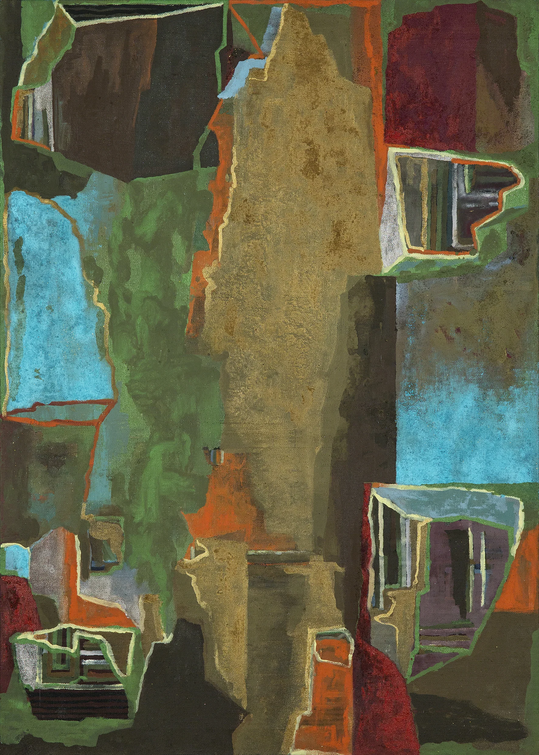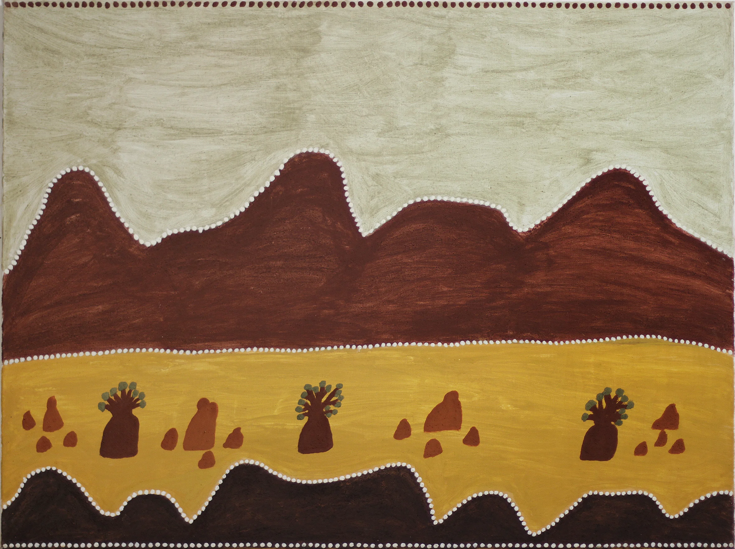 These paintings grew out of a number of everyday visual pleasures: a collection of small rocks picked up the bush, plants my backyard garden, the landforms of the Blue Mountains, mornings spent amongst the eucalypts in the Canberra Botanic Gardens, and the pleasures of painting itself, of Bellini, El Greco, Gauguin, of Romanesque frescoes and Indian miniatures. The process of making them was a much more instinctive and improvisatory thing than I have experienced before, listening to Miles Davis, John Coltrane and Charles Mingus. Maybe as a result these paintings look a bit retro- a bit 1950s.