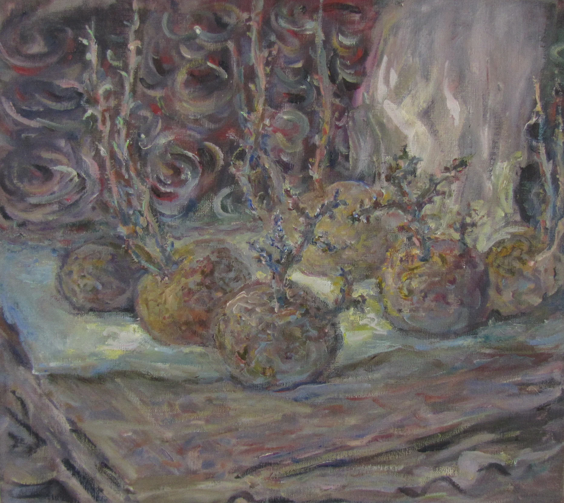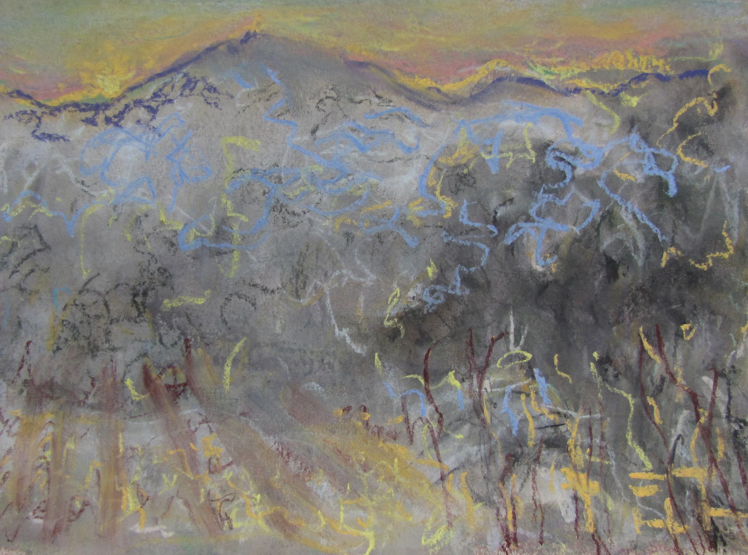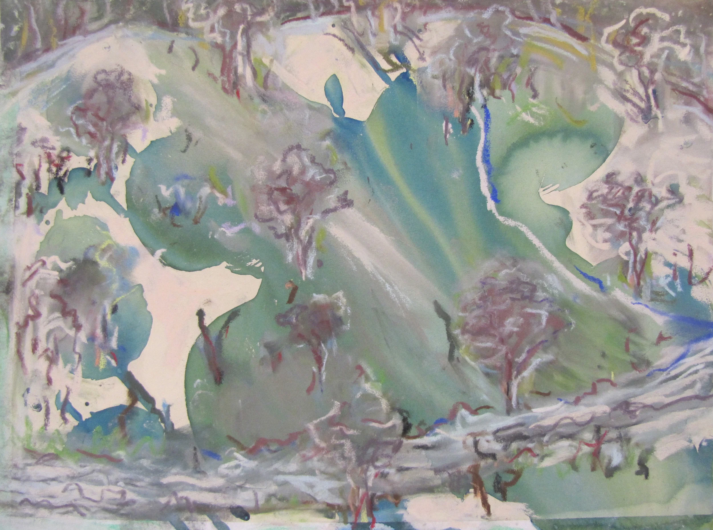 These paintings grew out of a number of everyday visual pleasures: a collection of small rocks picked up the bush, plants my backyard garden, the landforms of the Blue Mountains, mornings spent amongst the eucalypts in the Canberra Botanic Gardens, and the pleasures of painting itself, of Bellini, El Greco, Gauguin, of Romanesque frescoes and Indian miniatures. The process of making them was a much more instinctive and improvisatory thing than I have experienced before, listening to Miles Davis, John Coltrane and Charles Mingus. Maybe as a result these paintings look a bit retro- a bit 1950s.