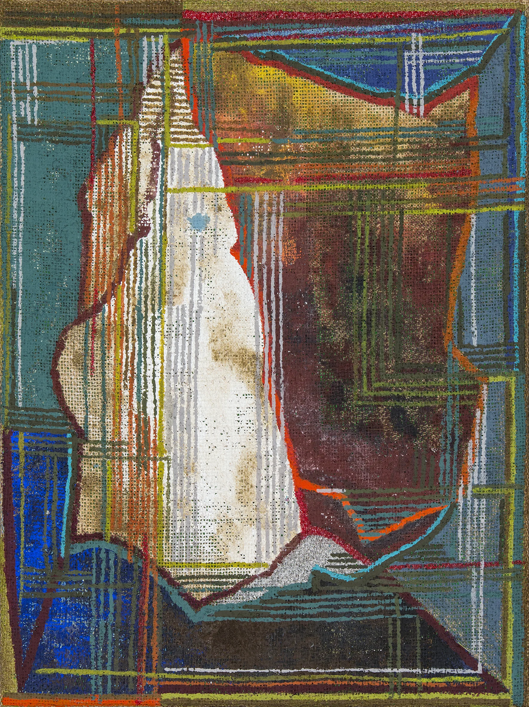 Bouts' St Erasmus lies there as his intestines are wound up on a winch while the saint, and his torturers, look on in relative tranquillity. In St Erasmsus and the Painting Machine Waller uses the structure of Bouts' painting and the winch to show the miracle of the pictorial space and an investigation of pictorial structure. It is all there on a frame (which looks remarkably like a loom), a construction beautifully painted and gradually dissolving into geometry. It is such a pleasure to see paintings well made and thoughtful, where theoretical considerations harmonise with visual concerns instead of illustrating them.