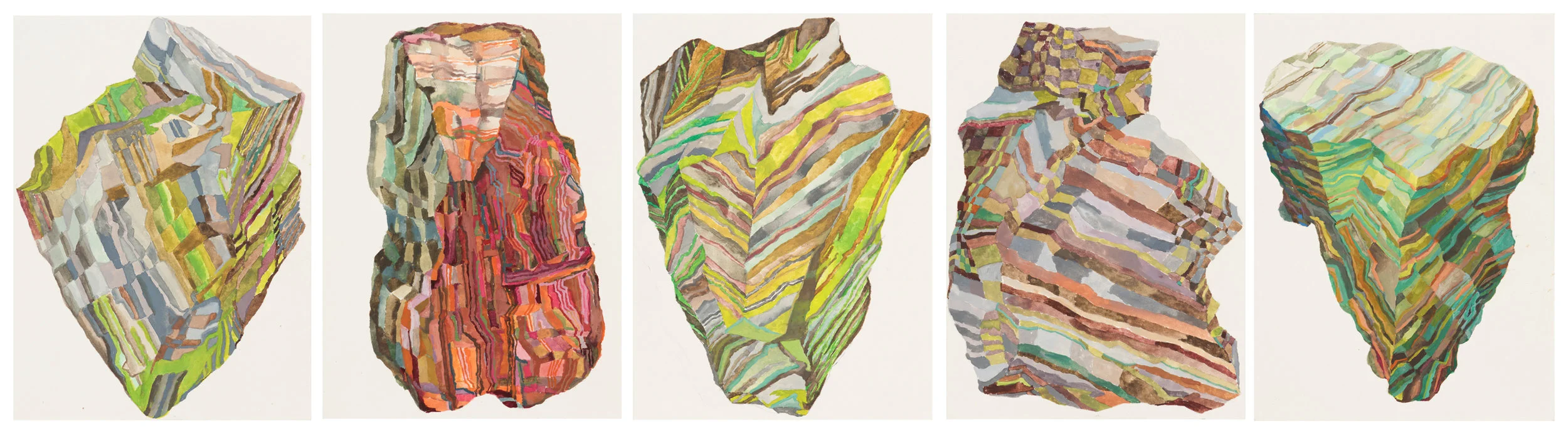 Recently I have found myself enjoying the experience of considering paint as a kind of mineral matter: of colour as a gritty and particular substance. And I enjoy the way rocks form and cleave with planar geometry and yet erode and crumble in ways more organic. Each is irregular and unique and is shaped by a specific series of events in the world.