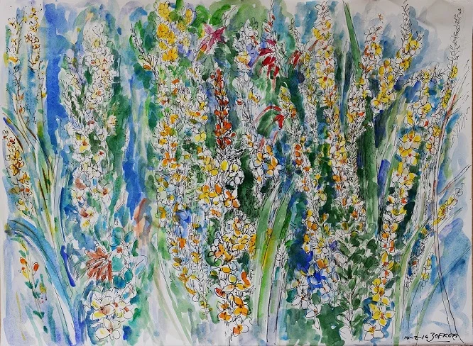 Following the commission, Zofrea embarked on a series of paintings, including Bellbird Hill, Kurrajong 2005 which was exhibited in the Wynne Prize of that year, where for the first time he truly embraced the colours and forms of the Australian bush in a major painting and celebrated it as the central subject. This triptych was made in homage to Kurrajong.. It is a painting full of energy that captures the distinctively Australian quality of the flora while at the same time enlarging and intensifying it in a way that has not been common in images of the Australian landscape by other artists, with the exception perhaps of Margaret Preston (1875-1963), who shared Zofrea's passion for native flowers, albeit mostly in a domestic, rather than natural, setting.