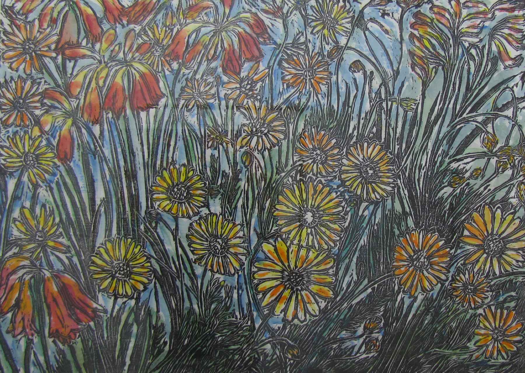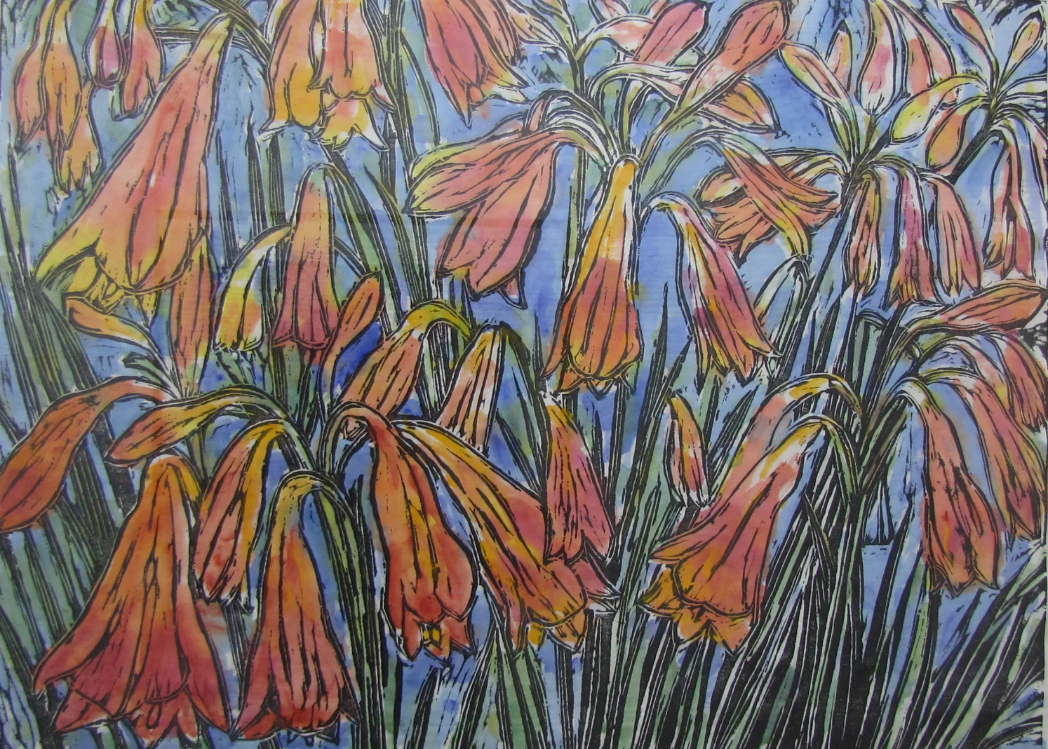 His woodcut prints of the bush are joyous incursions into an abundant world teeming with life and colour, sound and movement. The picture plane is often compressed well into the foreground, further intensifying the sensation of the viewer's immersion in the subject. The artist depicts native birds and wildflowers, most of which are local to the Sydney region. Often native flowers are small and easy to overlook in forests and thick scrub, so Zofrea will seek them out especially in walks to photograph them, capturing them in close focus and enlarging the image. This scaling up he repeats in the woodcuts, imparting a sense of discovery and admiration that expresses his emotional response to his subject, through making smaller elements larger than life or composing the image to emphasis relationships, such as groupings of flowers that may not exist in nature.