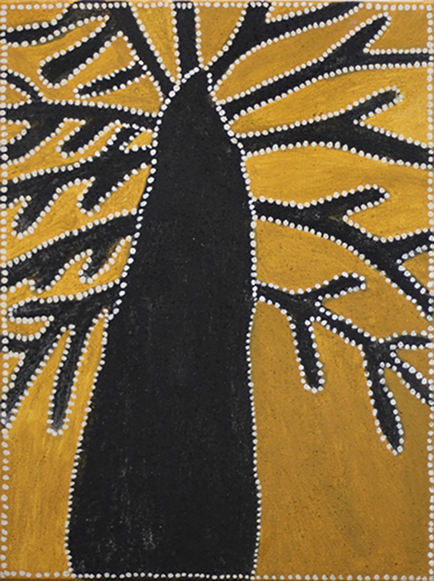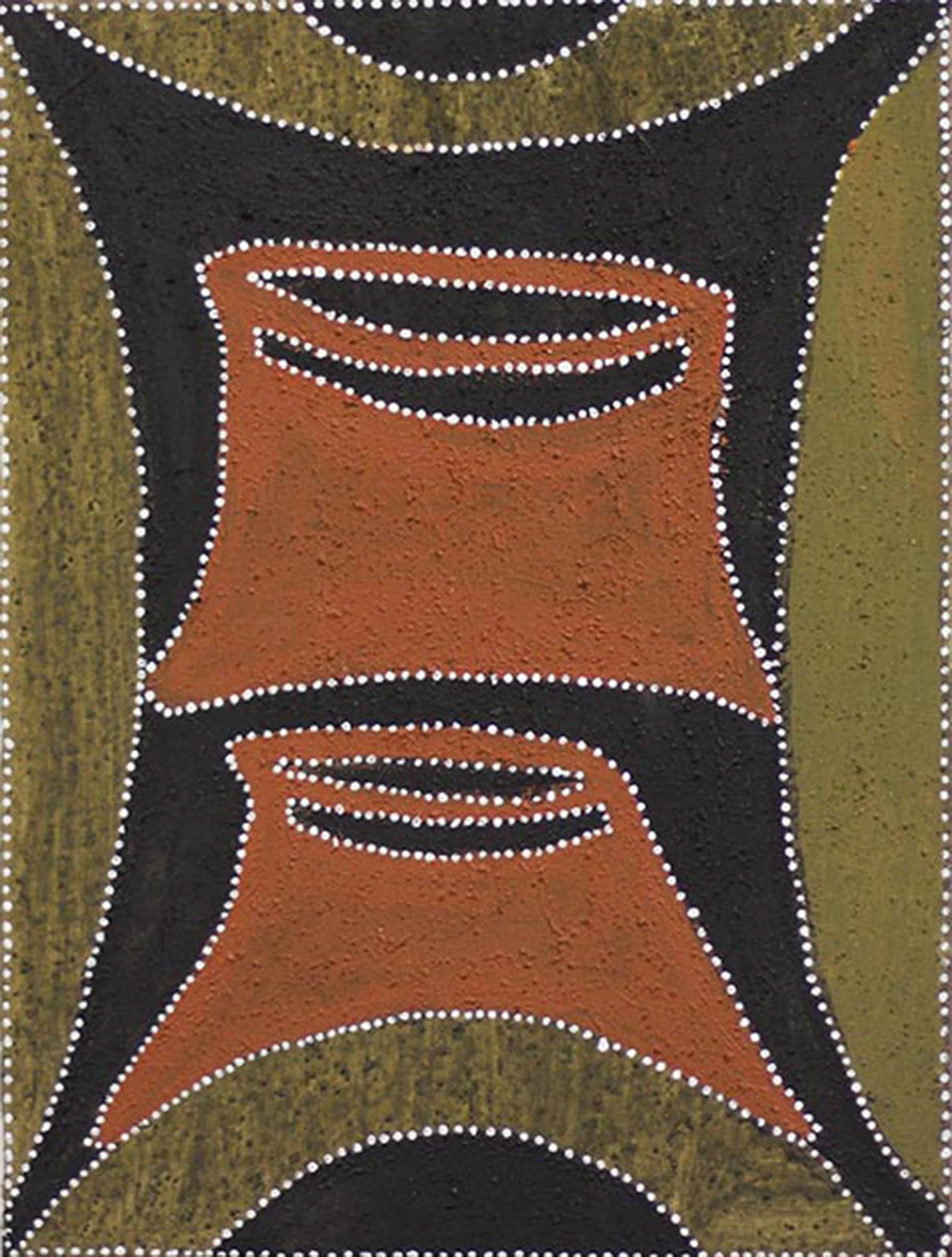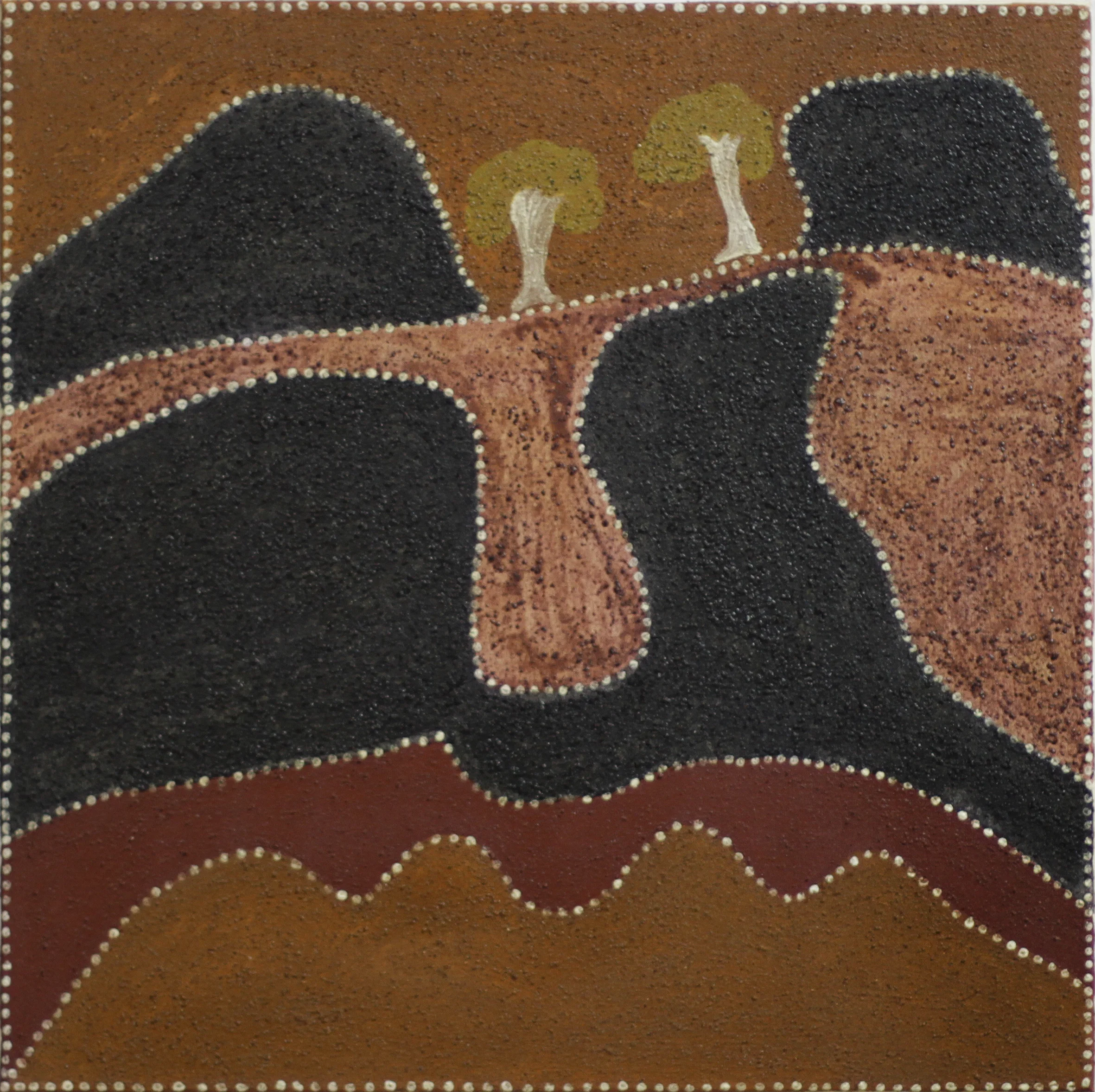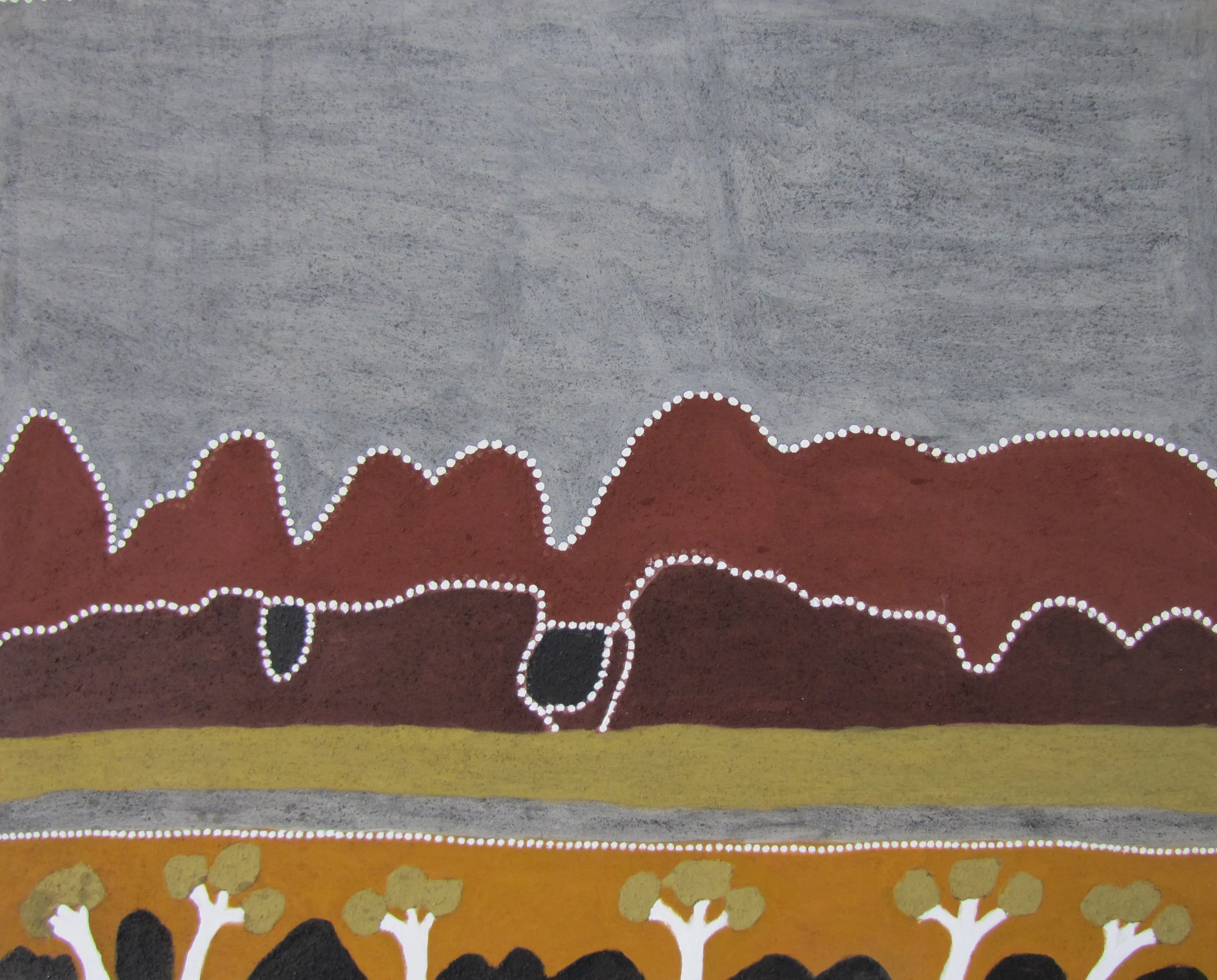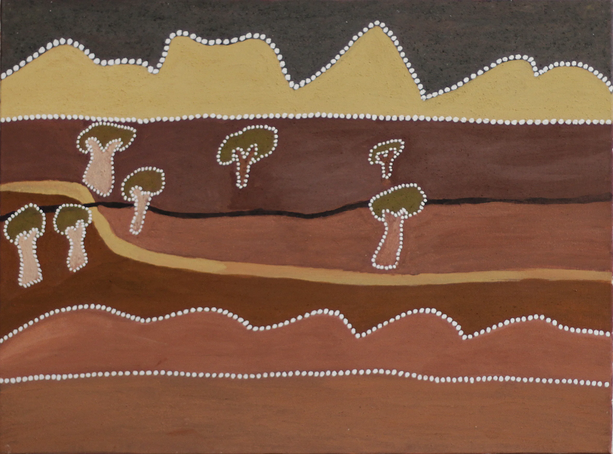 Natural forms and geographic locations articulate cultural histories. Features in the landscape such as hills, trees, rocks, waterholes and rivers appear as motifs, but they represent the history of the land.