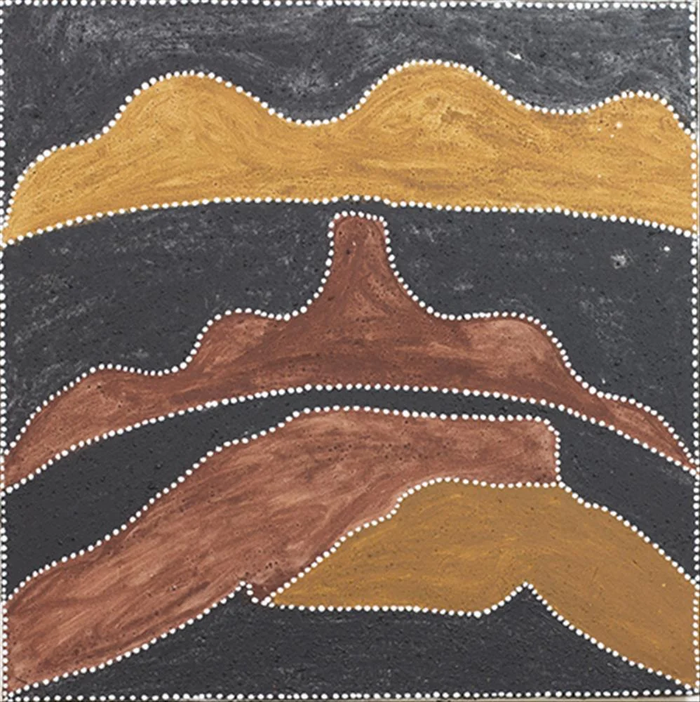 Betty Carrington uses a large range of ochre colours, her palette and style often describing strong and painful stories of historical events in the East Kimberley. One recurring visual reference in her paintings is the rolling hills of her father's country, Darrajayin (Springvale Station). She also paints landscapes from her mother's country, Texas Downs Station, as well as Ngarranggarni (Dreaming) places.